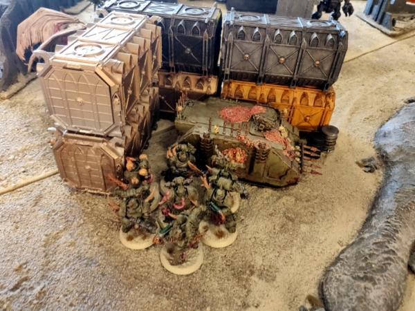 DG player auto-explodes the chaos rhino, which results in 4 dead plague marines from the emegerancy disembarkation.