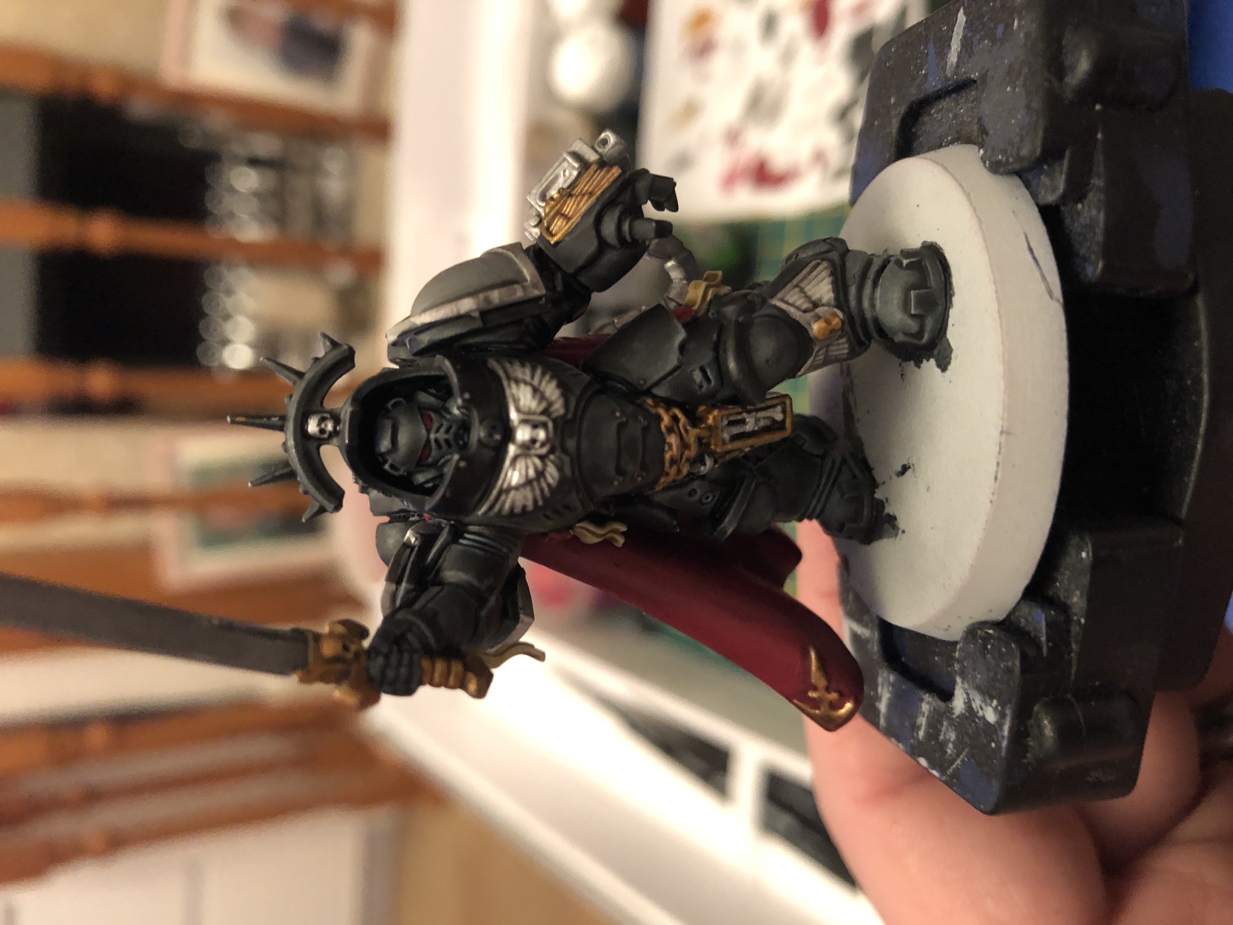 Looks good. Armor and the wing symbols both have good contrast going, though some edge highlights on the upper side of the plates might help define them and help them pop more. Some of the metallics, especially on the bolter look a little flat, but could be the lighting. Once he's based up, he'll be a nice looking leader for your force.