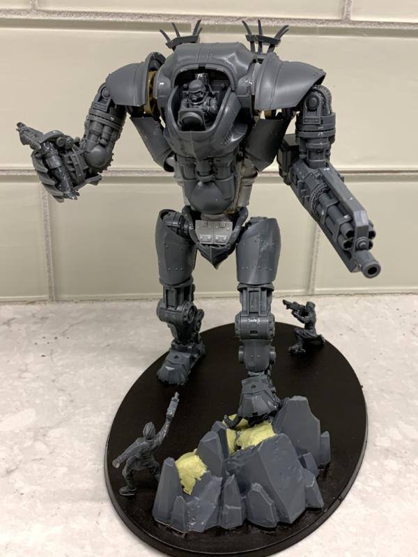 Started off with a 15mm scale Dreamforge leviathan, but as that is a bit too short for a knight (4.6”, so it needs an extra 1.5” to 2.0” inches in height). So I extended the legs and the torso, then widened the shoulders and chest. Changed the head (as it didn’t fit the 40k aesthetic ). Added a few valhallans having a bad day to the base (and claw). Weapons switch out (so it can double Gatling,or have claw and reaper chainblade). (Still need to add the flamers to the gatlings).