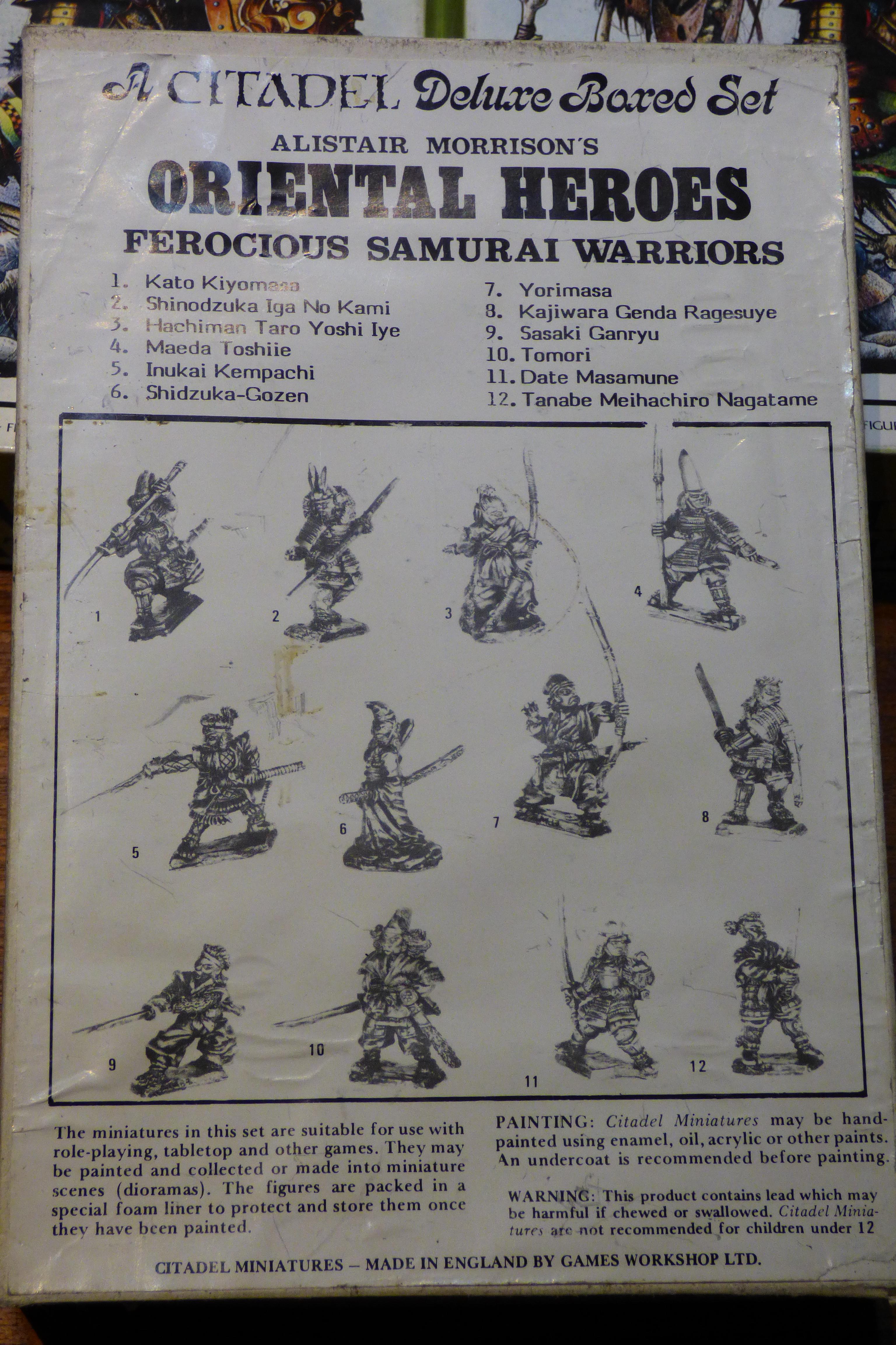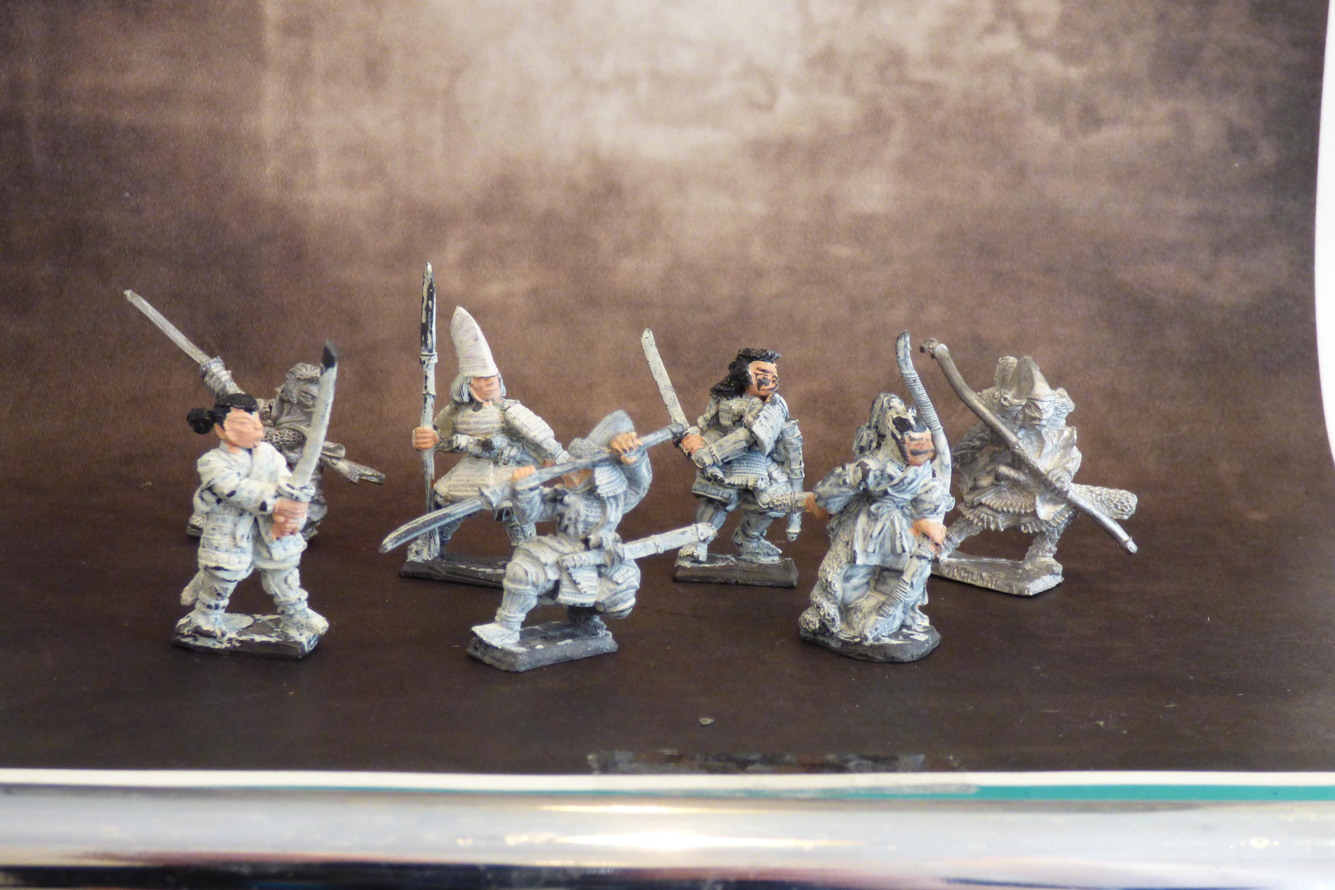 Here's a look at my starting materials, a couple of copies of Aly Morrison's excellently sculpted Oriental Heroes boxed set, the definitive Nippon models to my mind. Lovely designs, dynamically posed, exquisitely detailed and a huge pain in the rear to paint because of the microscopic lacing on the armour plates.