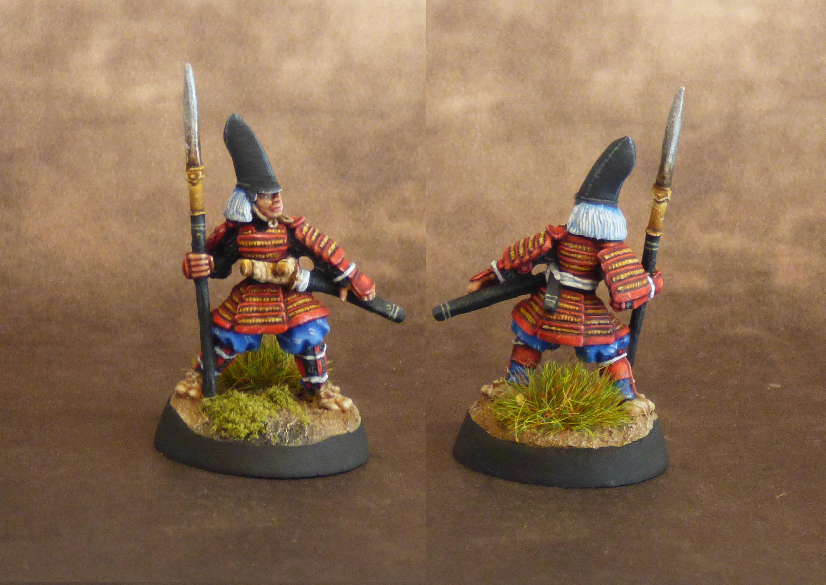 Finally another archer, this time an ashigaru soldier named as Hachiman Taro Yoshi Iye. I had to completely remake the bow from styrene as the original was so massively bent out of shape it was unfixable. I really like the deer-fur chaps that he's wearing, quite a characterful mini really.