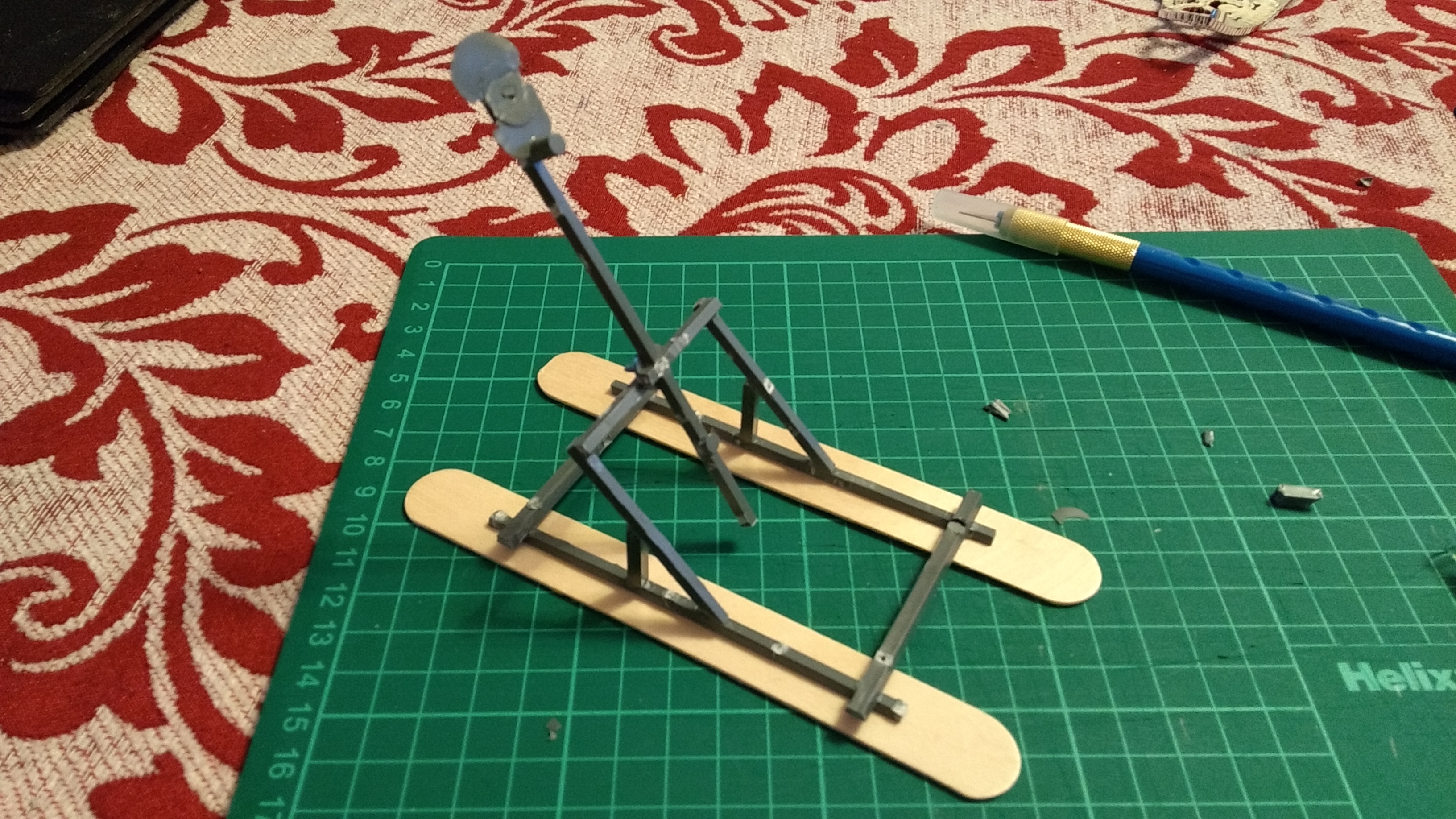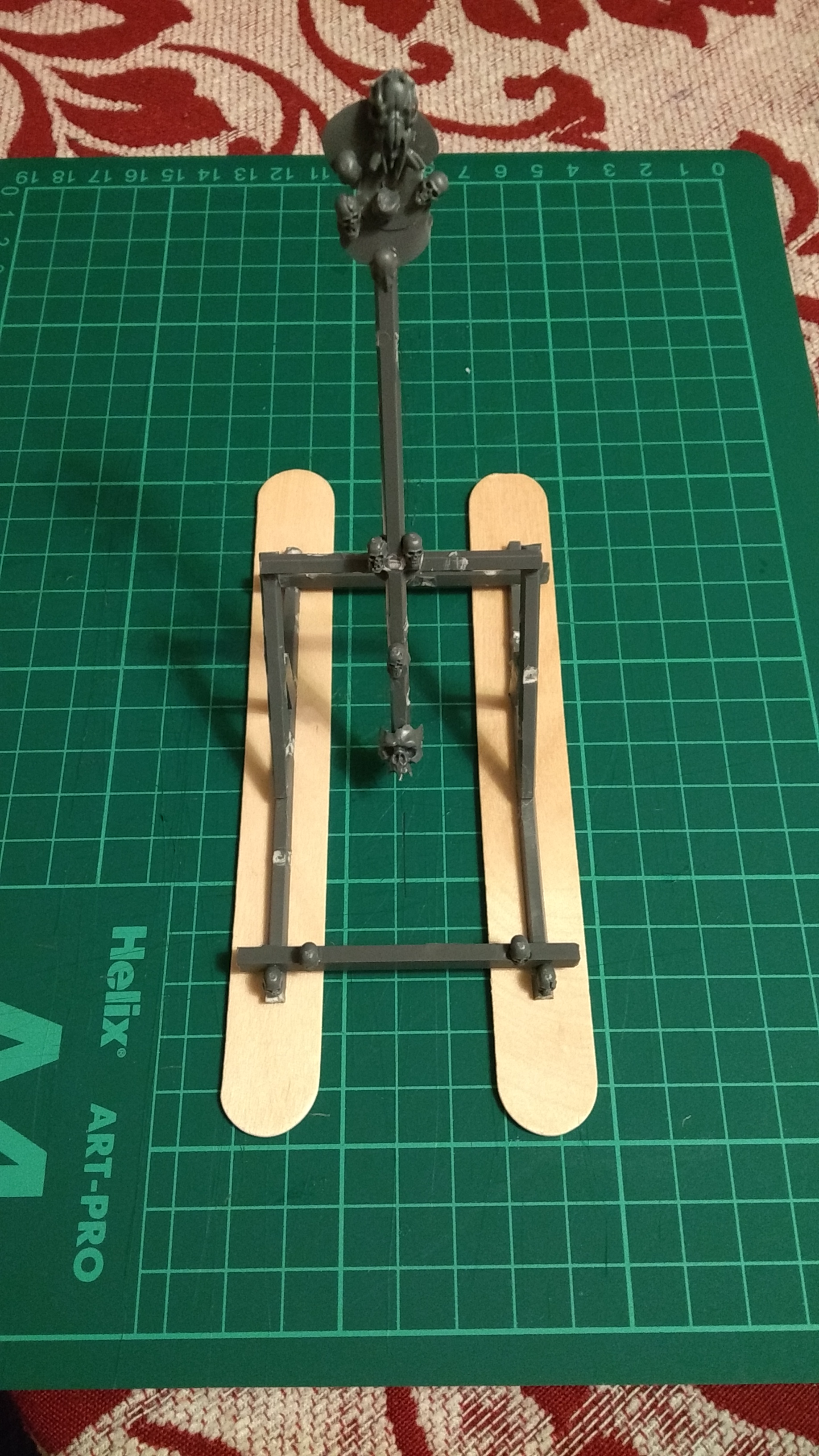 As the title says, I have knocked together a Screaming Skull Catapult from leftover bits of sprue (all from a Primaris Intercessor squad, in fact) along with a few Citadel skulls. Based on lollipop sticks.