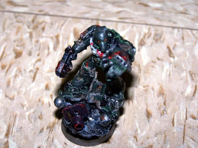 okay, I'm trying not to be too harsh with this: the green looks too dirty. okay, they're chaos marines but I would try to drybrush them some more and the base of the champion is IMO a bit too much. the "dress" (robe, whatever, I have no idea) looks okay, but I would stick with brown, not yellow.