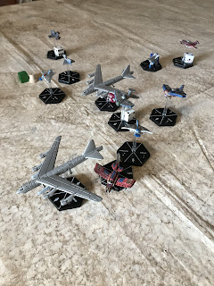 The Ork settlements are placed 24 inches in from a short edge and in 12 from the long edge. The Imperials are coming in on the short edge at high-altitudes and full speed, which is not very fast for heavy, 4-engine bombers. The Orks on the other side were at various heights and speeds.