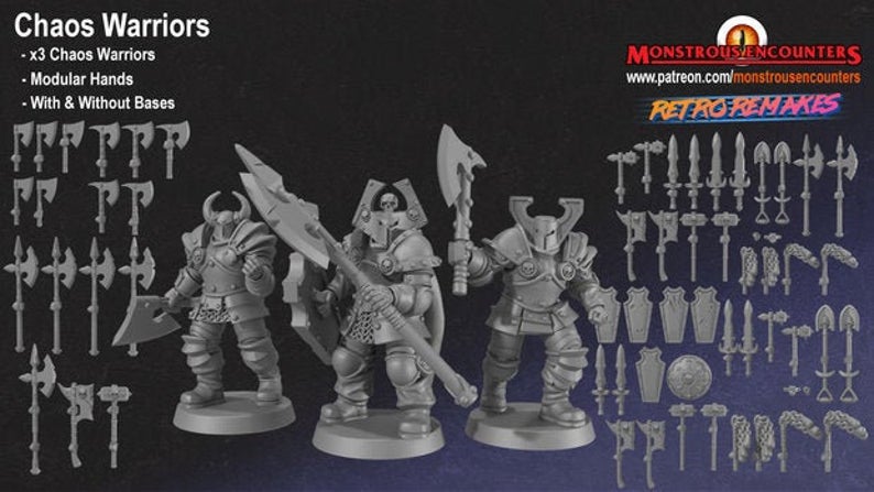 Anyway, I always loved the previous version of Warriors of Chaos from GW's fantasy line, and always wanted to do something with them, and they were exactly what I wanted for my Crusaders in terms of looks. Problem is, Crusaders are all equipped with power swords and storm shields, while the Warriors of Chaos sprues have a variety of weapons that would be confusing (maces, axes, etc) and I couldnt tell if they came with shields at all.