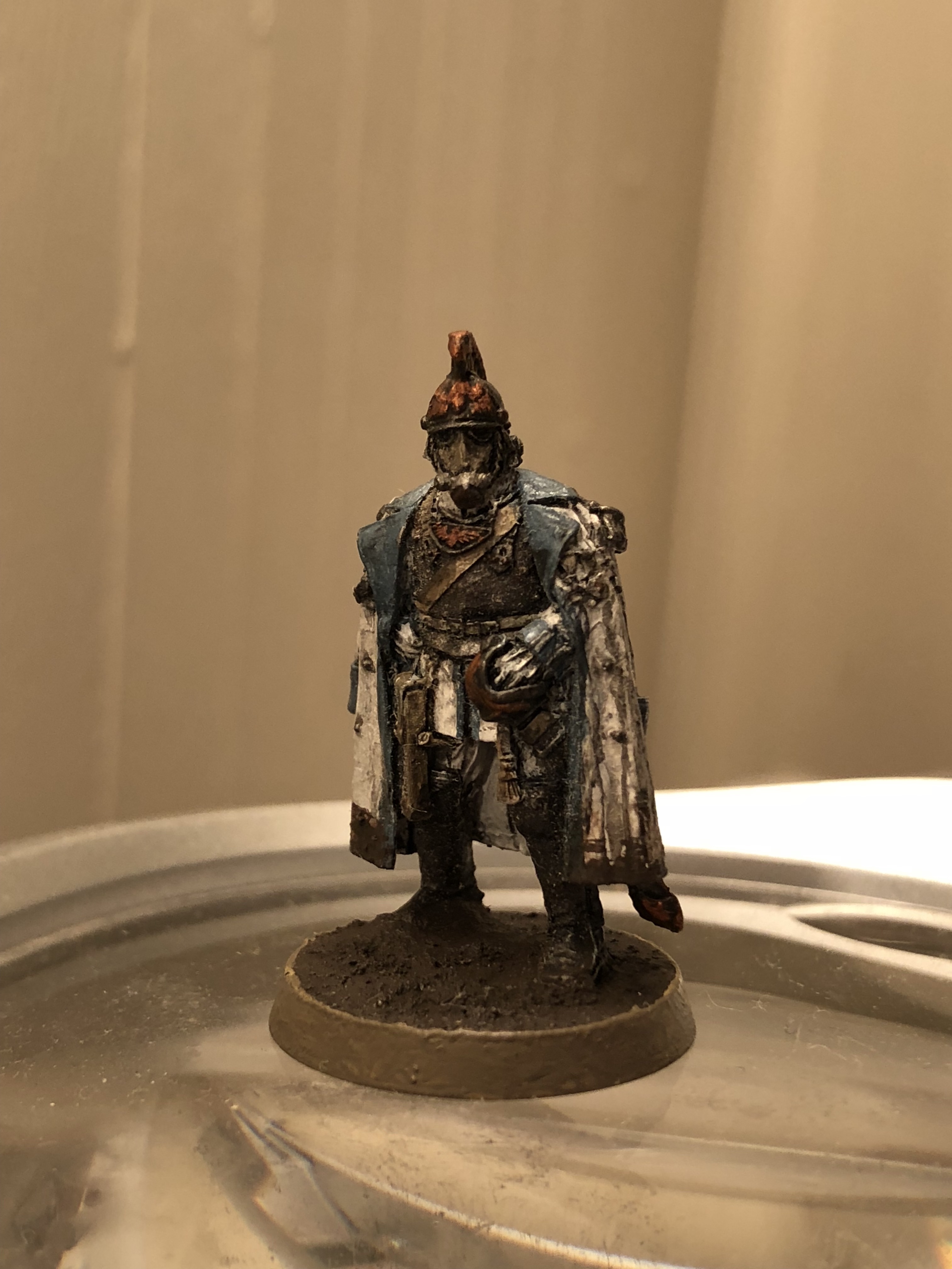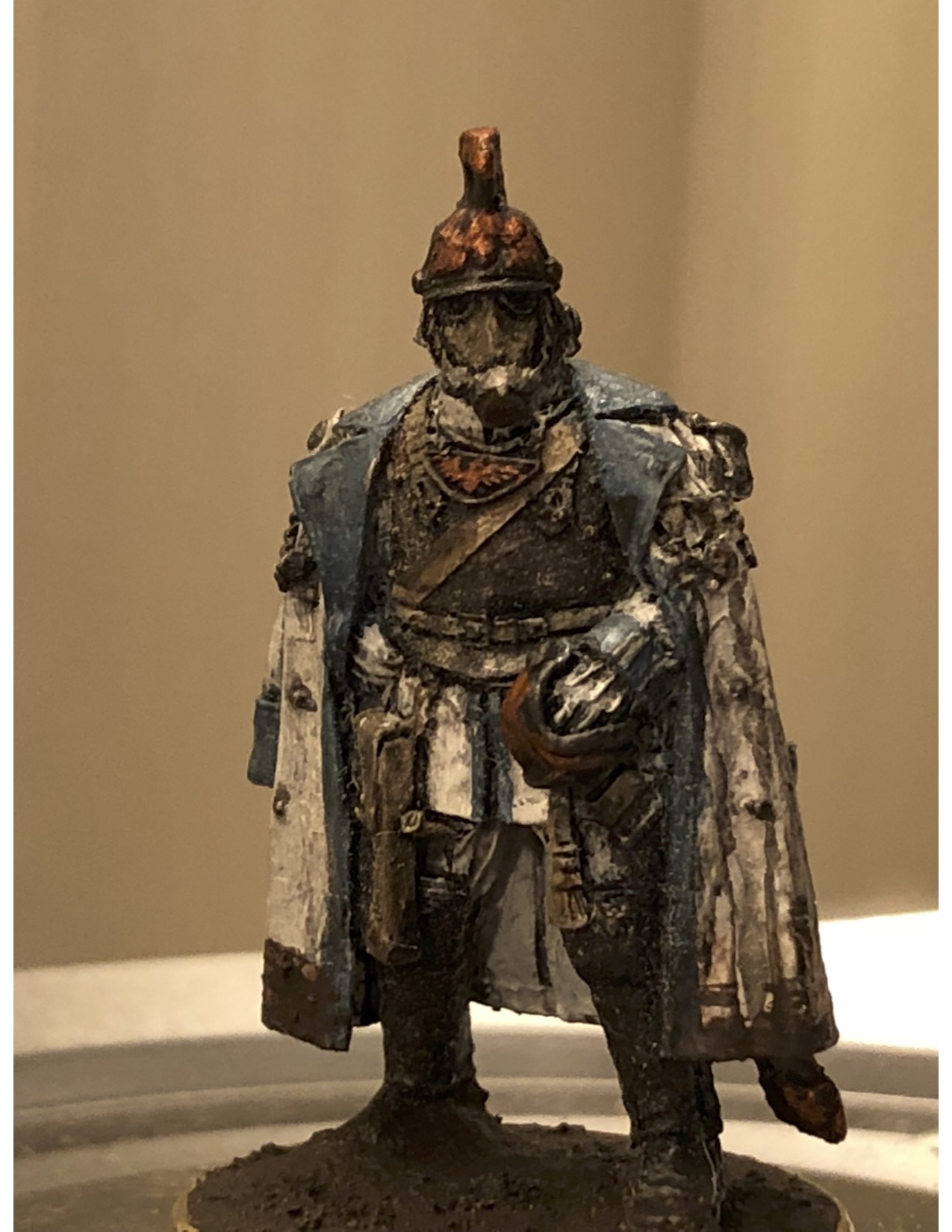 I'm not a fan of mud and blood paint schemes, but you've done an effective job of dirtying up the poor Krieg-er. The only thing that pops to mind is the epaulets are colorless and maybe switch the copper for something closer to brass (also the coat buttons)