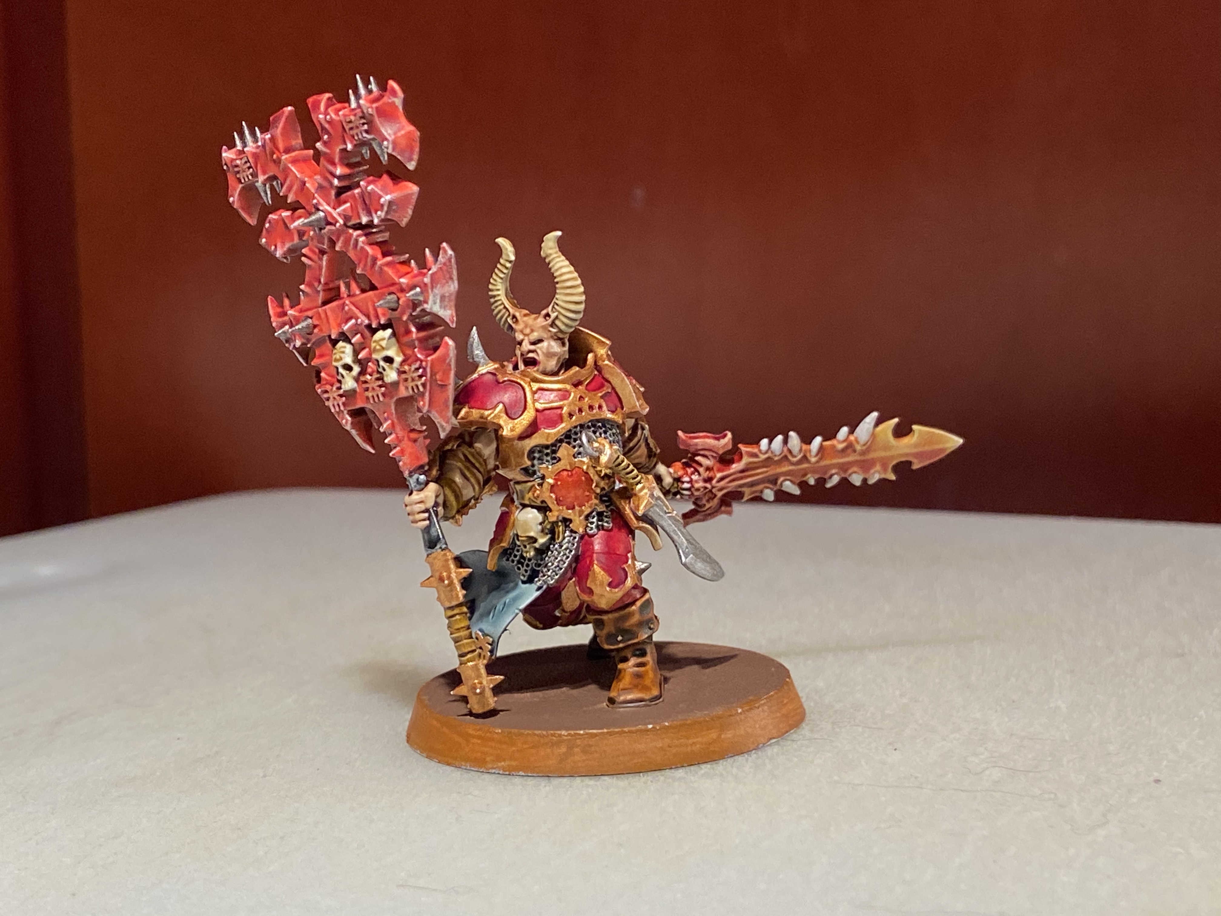 Made a converted one with a blade instead of axe using Aspiring Deathbringer body, hands from Skullreapers and the head from a Varanguard model. Almost entirely contrast painted, and the blade was contrast blended with dry brushing Dorn Yellow over it.