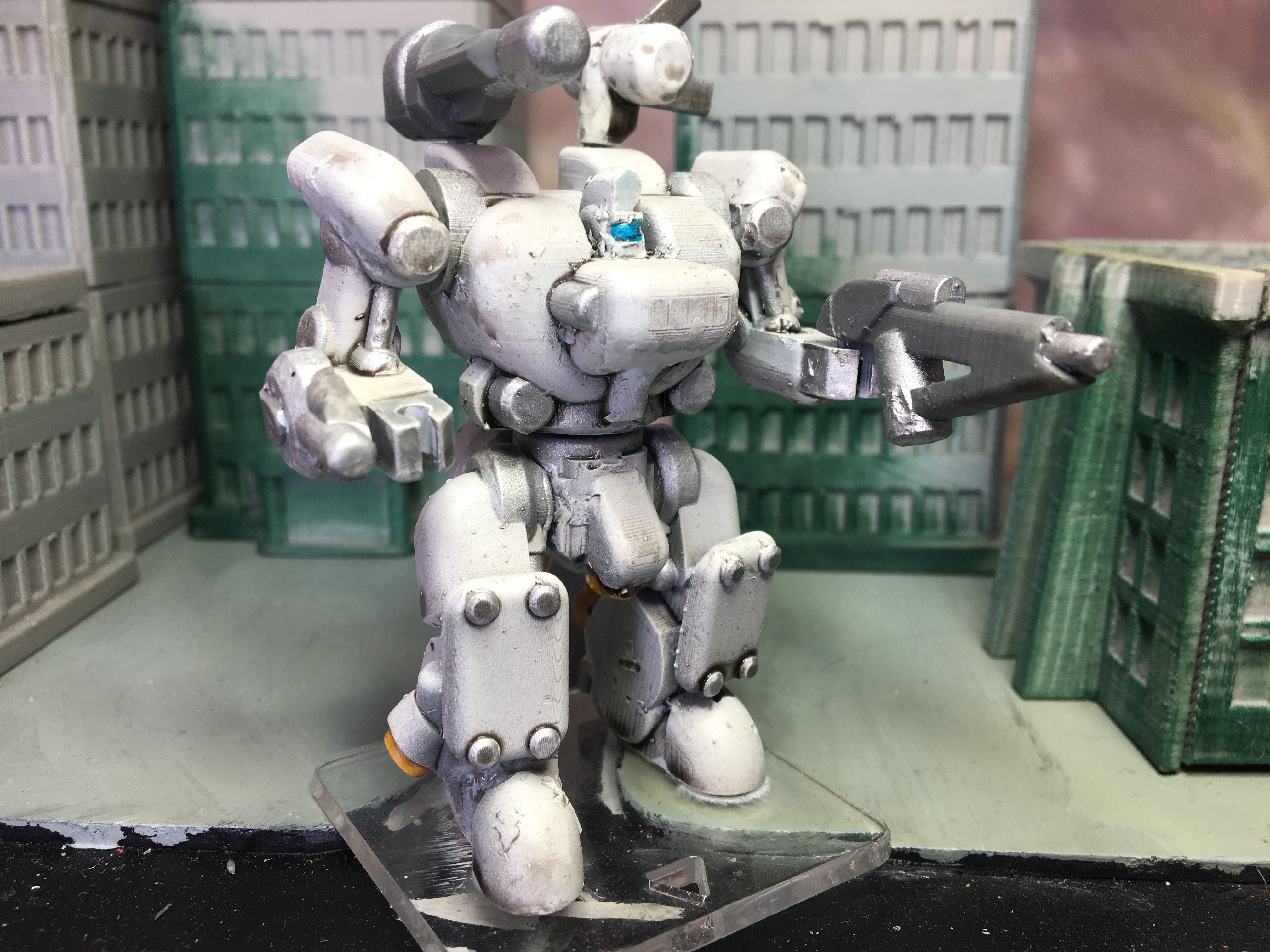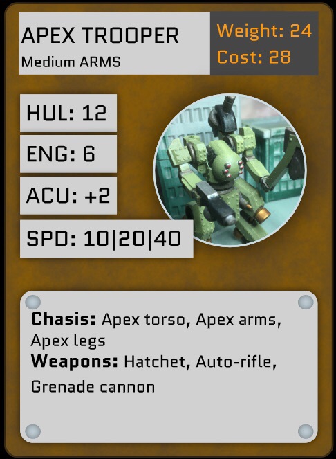 Over the last few years Ive been working on and off on a tabletop miniatures game concept revolving around 1/144 scale mech combat. In the game, giant robots called A.R.M.S take to the battlefield at the behest of isolated and fractured city-states to secure resources and defend their people from rivals.
