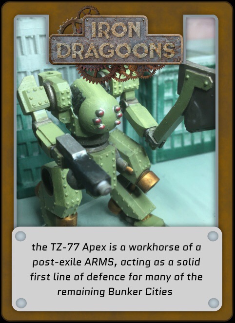 Currently I have nine core ARMS developed, half a dozen alternate legs and arms, and around forty equipment pieces. All of these parts need their cards designed and studio models printed, painted and photographed.