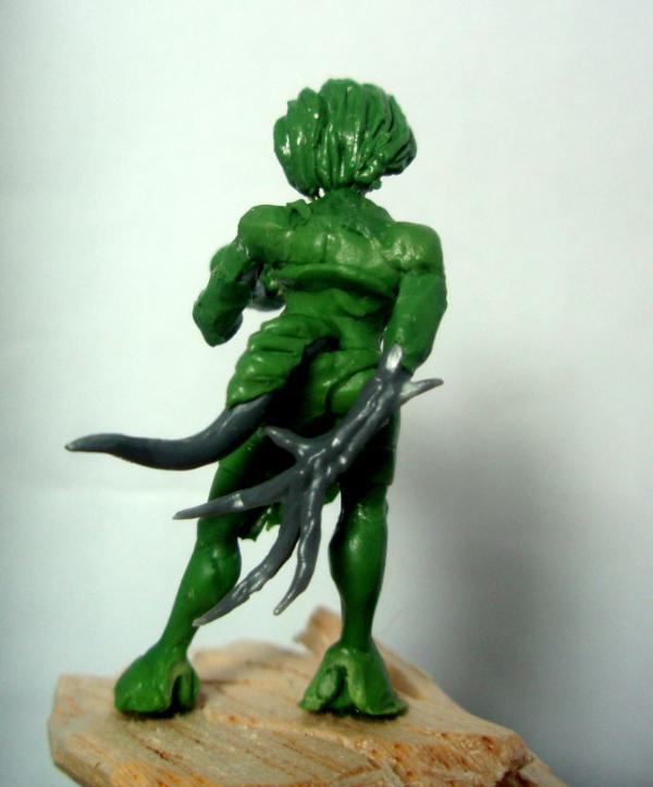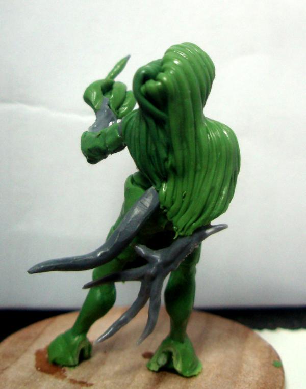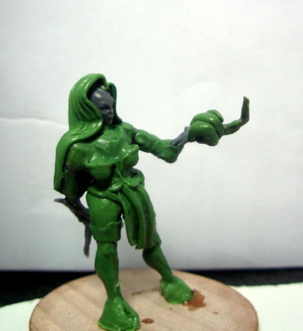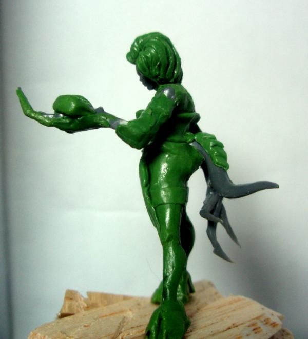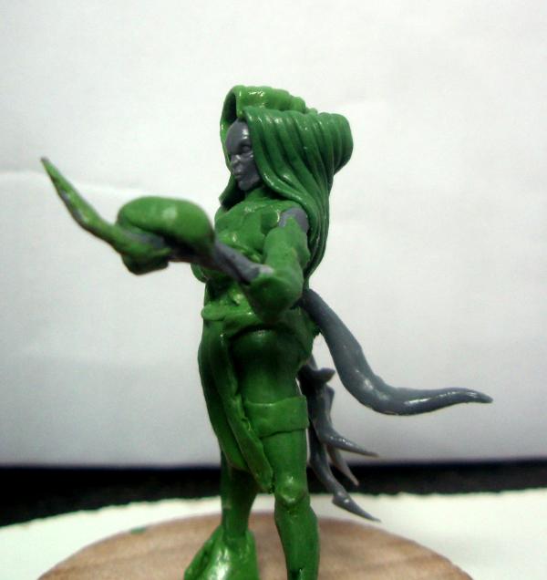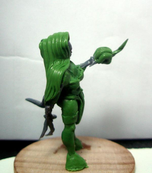My camera sucks. It's weird, it seems to highlight each different shade in the various greenstuff, thus making it look like there are extra line and such in the sculpt (her legs from feet to waist are very smooth) while minimizing the details in the folds of the dress and hair. Whatever, certainly a good camera set-up isn't where I can spend my time and resources.