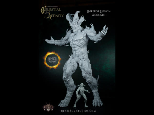 Demon Emperor Ar’onath is a colossus. A highly detailed and beautiful miniature that exudes personality and atmosphere. As part of their 54mm scale world the character represents the leader of the invading demonic race. As can be seen from the image, The Emperor towers over his minion, which is no small mini in itself standing at 60mm.