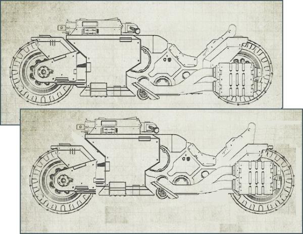 Looking at the sprue: according to the "lore" of things, apparently the engine block was designed with "more armor" around the engine block than the regular bikes... But in actuality, it seems like GW couldn't bother to design/produce mold plate with actual engine blocks and decided to just cover it up with large flat panels.