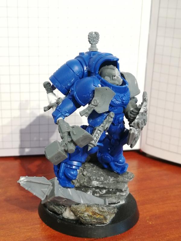 I did not had a jumpack captain, although is a really popular choice on the tabletop, and I really liked the jump marine asthetic. Normal jumpacks though, might be a bit too normal for a captain, so I had the idea to convert an inceptor into a jumpack captain, with a big thunderhammer and a dynamic pose.
