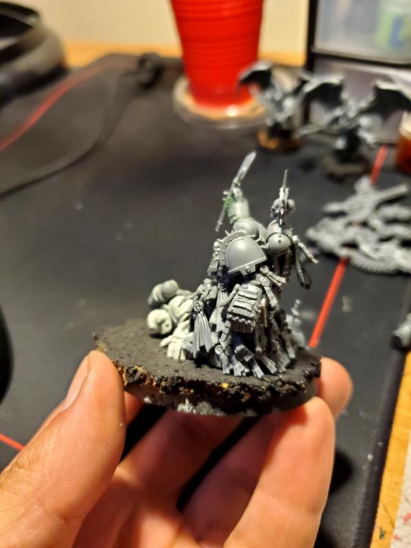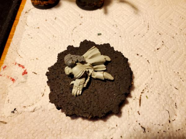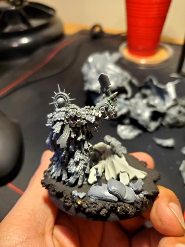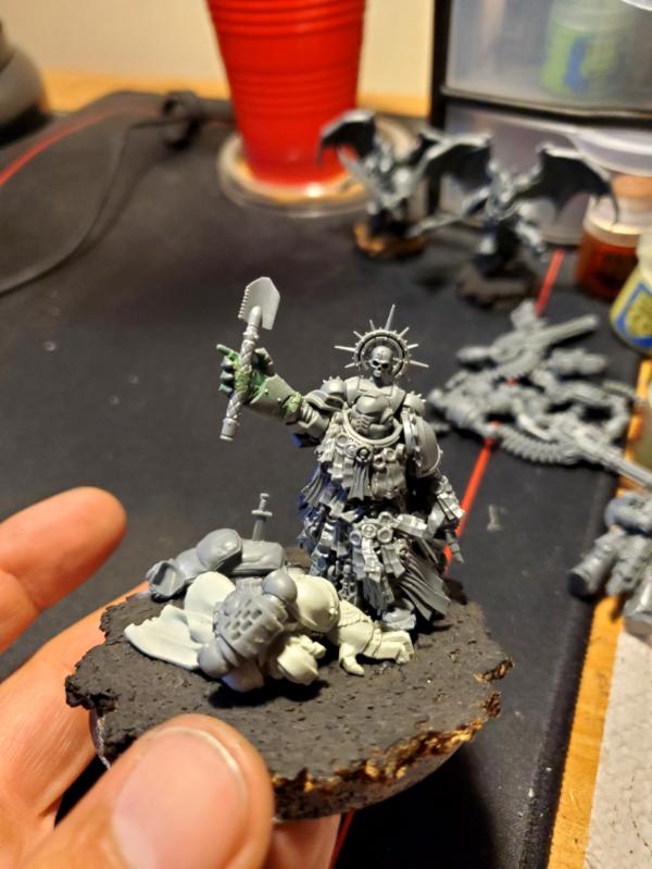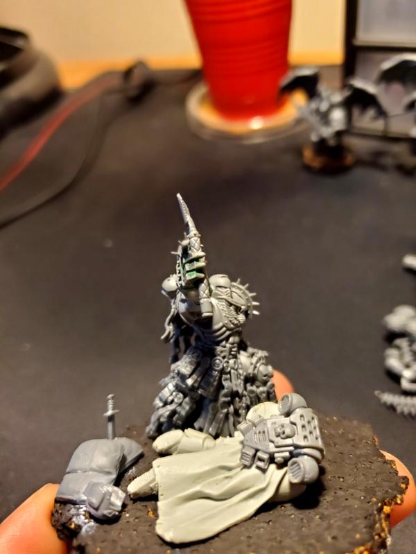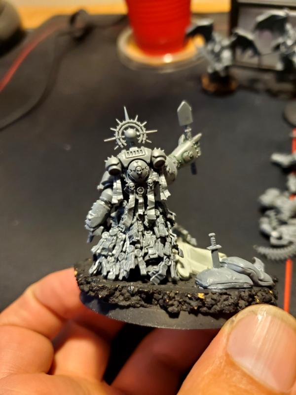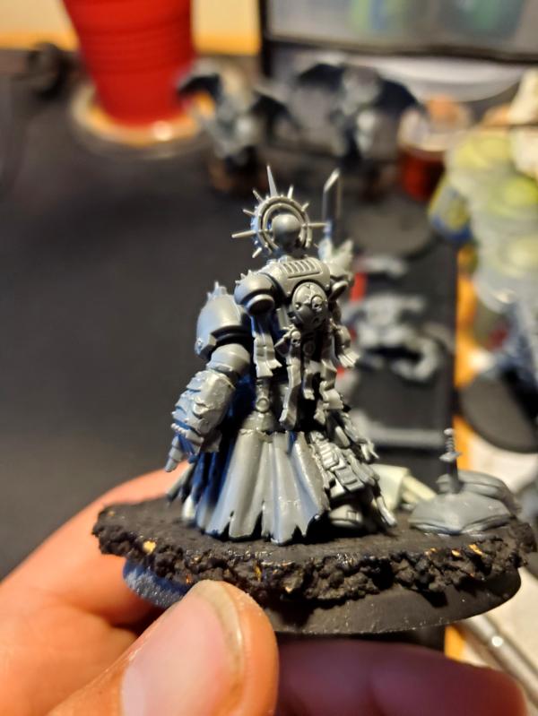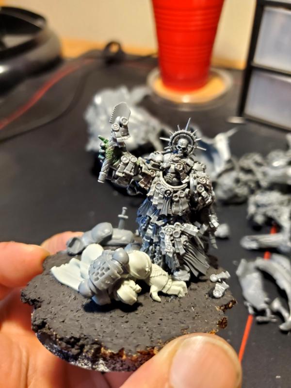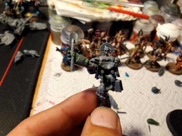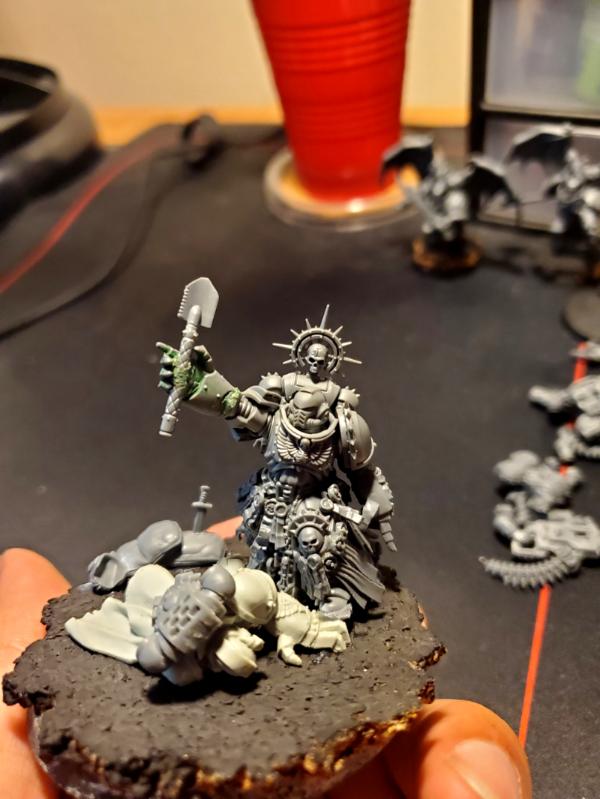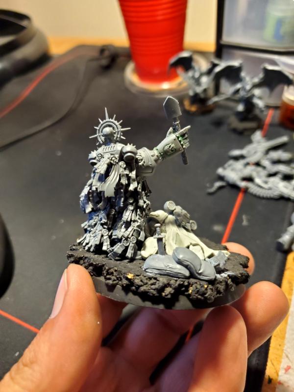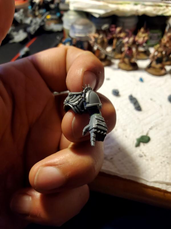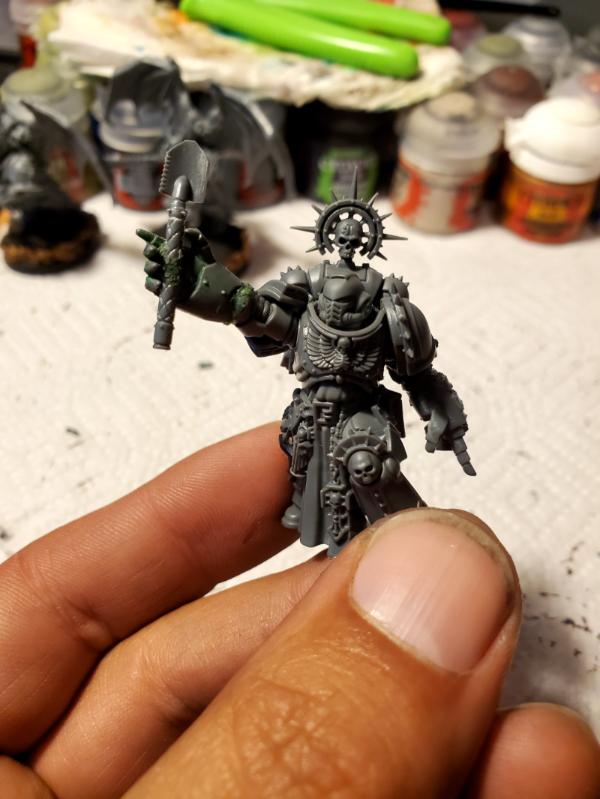 I got to do a bit of work on Puritous Sealious tonight. I used the new Primaris Chaplain from the Indomitus box set as a base. I had some old space marine power fists I was able to chop up and file down. I clipped the Chaplain's hand off just after the elbow and attached it with green stuff. I then clipped the handle of the Chaplain's crozious into 2 parts and used green stuff to stick it in the palm of the power fist then used plastic glue to attach the shovel head on top of the handle. I'll be using a helmeted head just because I like the look a bit better. For the base I was thinking of clipping off the bit of rocks his left leg and have him standing on one of the old space marine casualty models I found in my bits box(painted as a pretty marine of course). I asked players from the local shop for any purity seals they could spare, but haven't gotten any yet. I'll be there this coming weekend so hopefully some will be waiting for me. I'll try and get some more work done on him tomorrow when the green stuff dries.