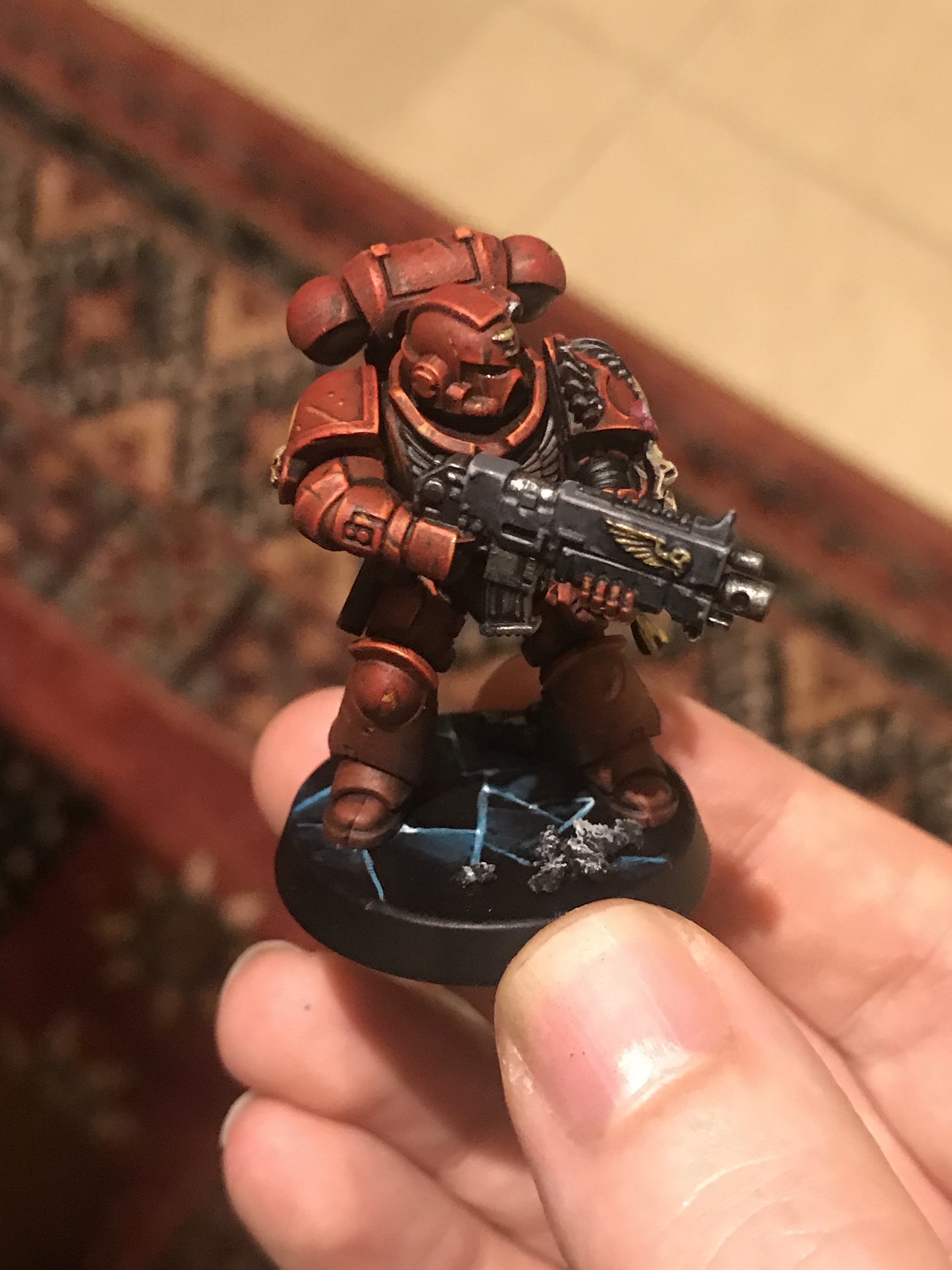 Very effective work, I've always liked dark reds for Blood Angels, and the iconography you've added have brought them back to what I "expect" a marine to look like.
