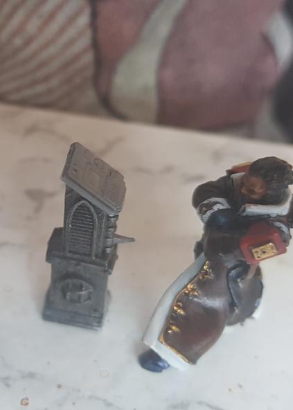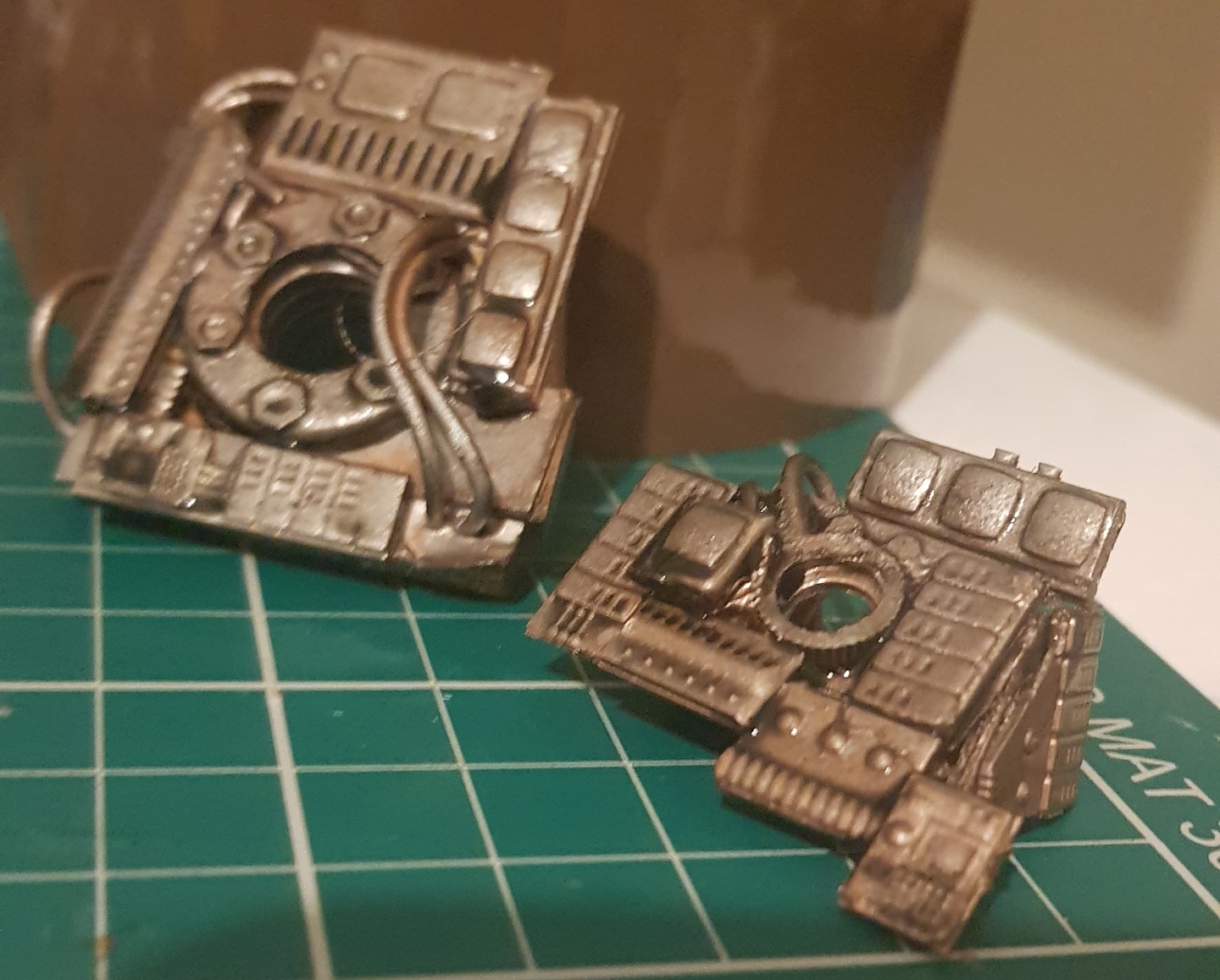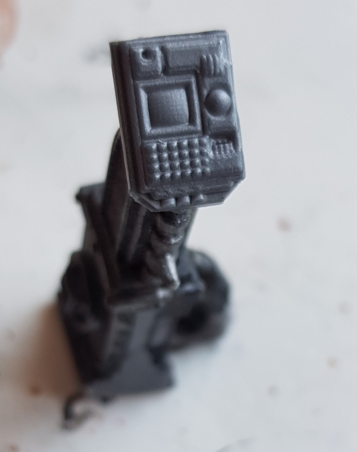 I sprayed the walls and computers with a copper, then directionally highlighted the walls with a gentle dust of gloss white. I highlighted the computers with a silver and then gave them a nuln oil wash.