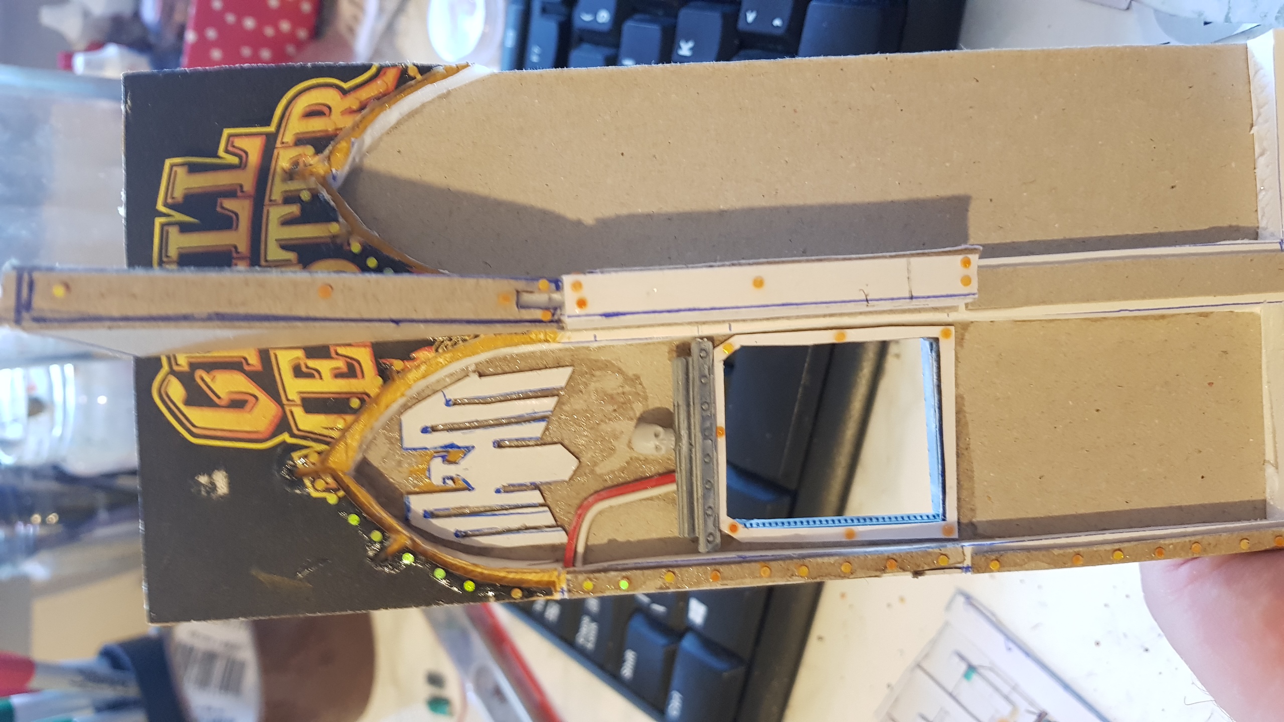 Looking good so far Do you have any plans to use lighting? I know you can get small lights quite cheaply these days and a lot of the best starship interiors use lighting to add atmosphere (see Red Dwarf from season 3 on and also Star Wars to a lesser extent-Eg the meeting room of the Death Star in 'A new Hope' or the Emperor's throne room in 'Jedi'-all quite moody due to the lighting). Keep up the good work