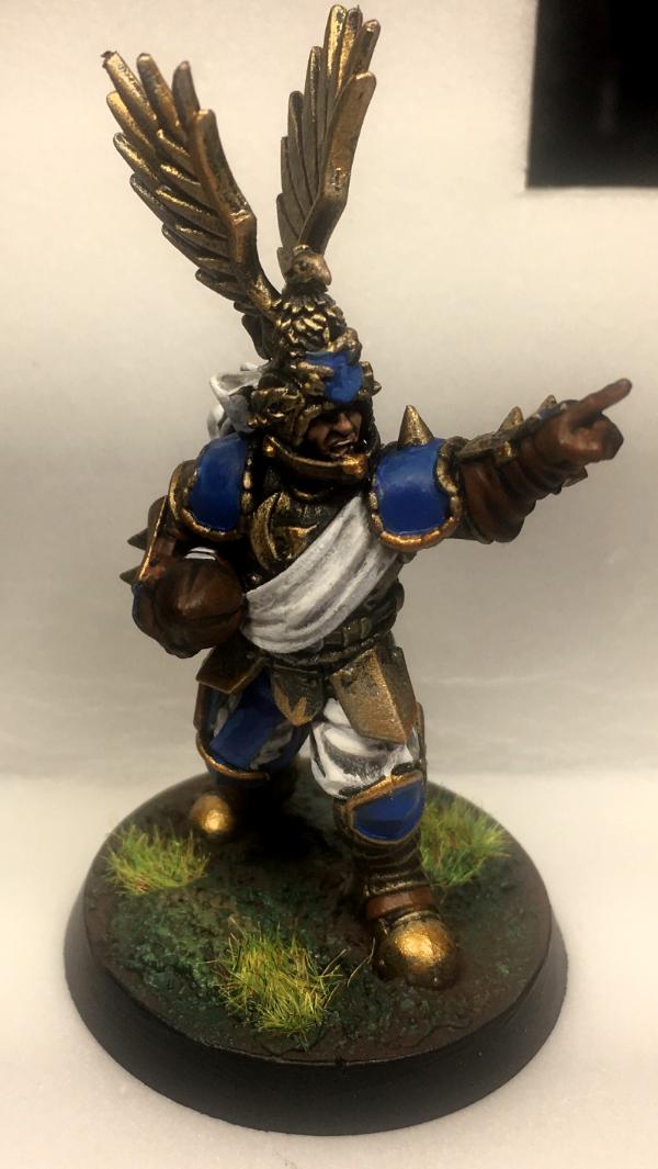 Painted this guy up as a Wood Elf. Tried something new on the skin with the green shadows, not my best work but lots of learning done! But I am very pleased with the feather (what I imagine to be Phoenix feather) to contrast all the greens, blacks and browns. Happy also with the gemstone and NMM belt buckle. NMM is a lot easier to make look good when it's this small!