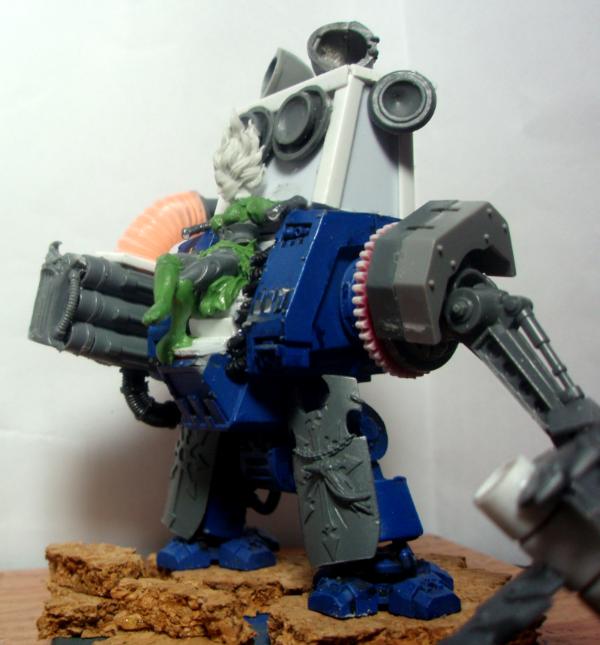 Look at this pic from my gallery. The Dread's claw arm. The piece coming from the shoulder is the leg off some sort of set in place gun emplacement I somehow had in my bitz box. I believe it held a lascannon turret. I just cannot think of the model's name. Defense turrets probably.