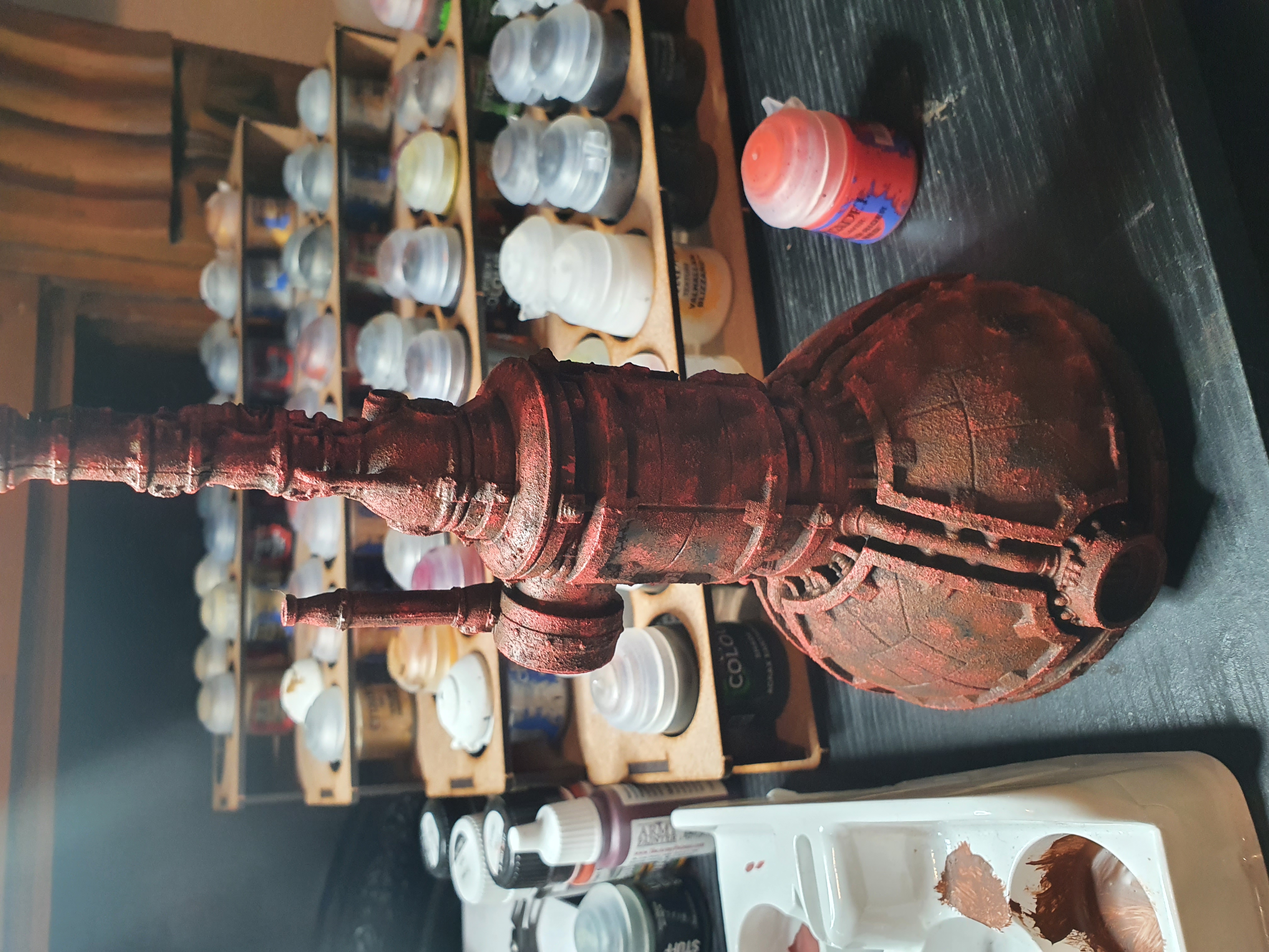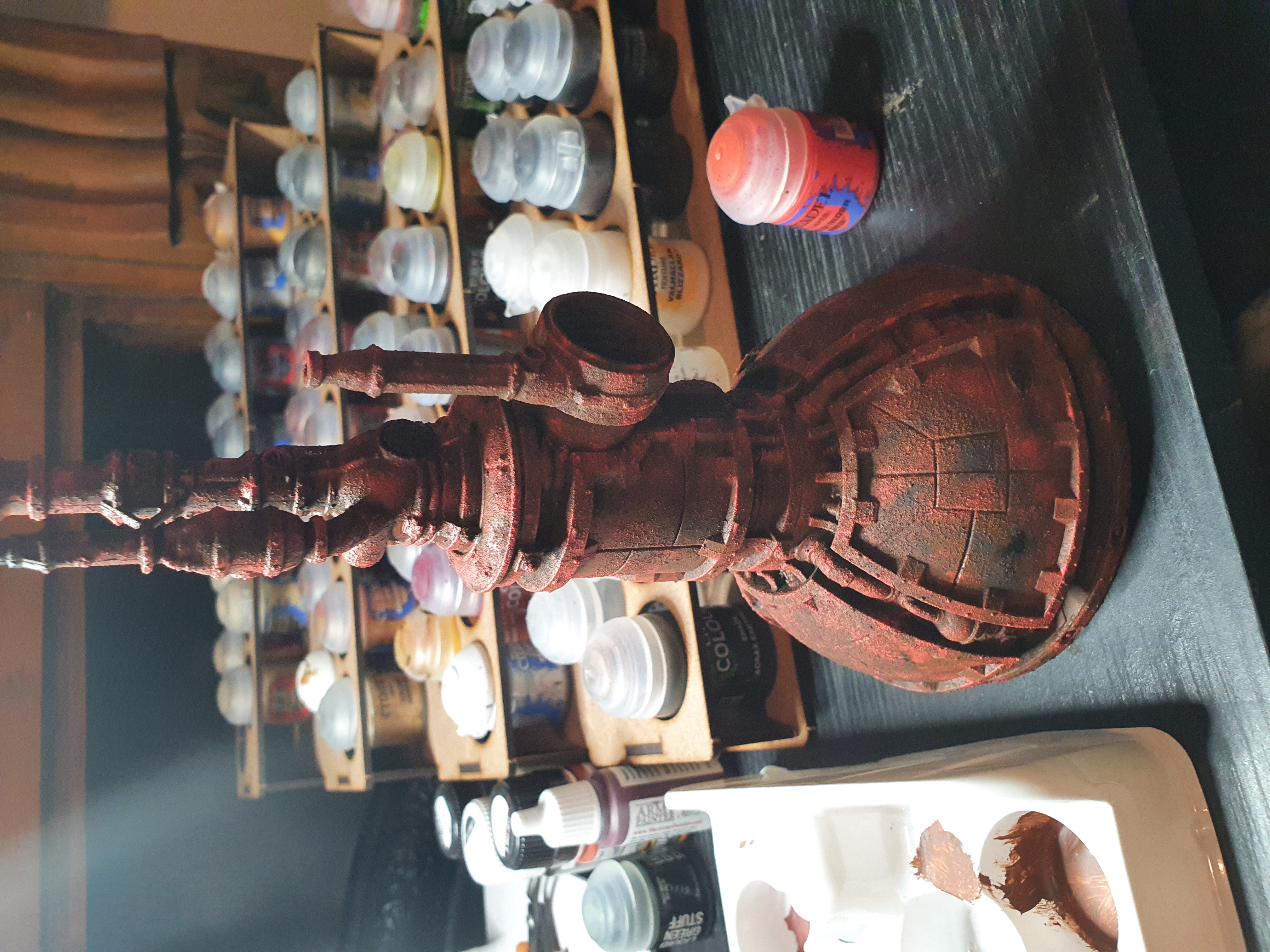 Typhus corrosion, mournfang brown, wild rider red,fire bright orange, zandri dust, agrax earth, ryza rust, iron breaker for the rusted effect using stippling and drybrushing mainly.