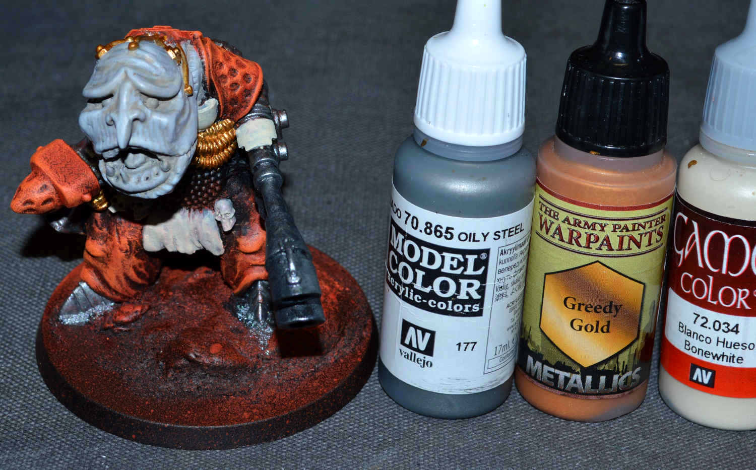 Basecoat skulls, scrolls and such with Khaki. Greedy Gold & Oily Steel on metals, followed with Dark Tone, Skeleton Horde, Shining Silver and Bright Gold. Then Bone White & Off White highlights on skulls & scrolls. Off White also for base coating plasma coils, eyes and certain areas of armor that will get checker patterns painted on later. Aethermatic Blue on the plasma coils. Careful Fire Dragon Crimson drybrushes on the red areas. Should have done this stage a lot earlier and not have to bother messing up other areas. I think that's all I've done at this point.