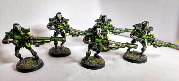 I'm on a roll with my Necron, so I decided to do a whole quad of Deathmarks at once, also to try Tesseract Glow. I think it works really well for small parts, like glowing orbs or glowing cracks. Probably not for blades, but I will try this as well.