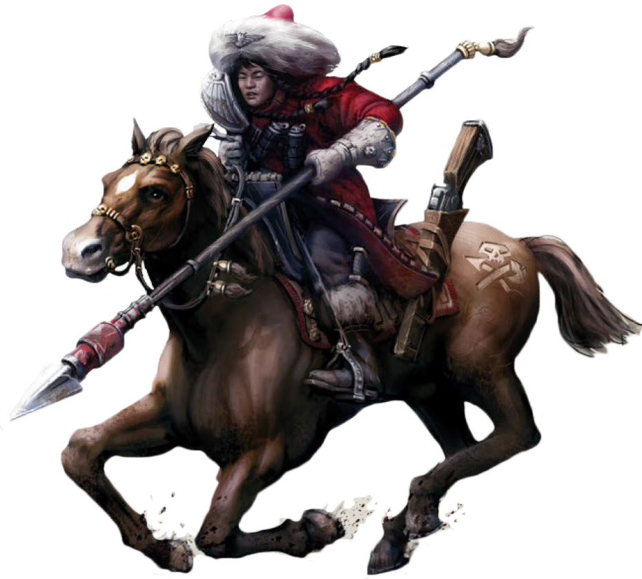 Or, bear with me here... they could be units of note for those specific subfactions! We have rules for Death Riders after all. Nothing saying we can't have Catachan Devils, Cadian Kasrkin, Tallarn Mukaali Rough Riders, Attillan Rough Riders, etc. And frankly? There is nothing but upside to putting the basic Rough Rider unit in as Auxilia, because then we don't have yet more random cornercase garbage we need to balance <Regiment> traits around. We also have an opening then to do something interesting and unique with design+aesthetic and opening things up for a fantastic expansion of the Guard range. FFS, the literal reasoning for the Conscript Order special rule is so they could still take Orders...which then STILL posed a problem, because a 50/50 shot to get Ordered is still better when you're doing 30 Conscripts FRFSRF'ing in Spamhammer than wasting multiple Orders on Infantry Squads. Here is official artwork of a Tallarn Rough Rider armed with a hunting lance, btw. I've already linked the Tallarn Mukaali Riders earlier in this thread. Both very much <TALLARN>, though you can also take them with chainswords or power swords if you'd prefer. You want to model your <CATACHAN> Rough Riders as Attilans seconded to the regiment instead of lizard-riding musclemen, more power to you; you can also model <KANAKI> Hellhounds as shiny Praetorian tanks seconded to a Feral World Regiment that "shouldn't" really have them, or model MILITARUM TEMPESTUS Scions as Cadian Kasrkin. That's entirely up to the player.
