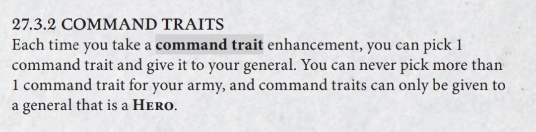 Stux wrote:How are you giving the Command Trait to a model that isn't your General? The enhancement rules say your army can only have 1 Trait and it must be given to your General.