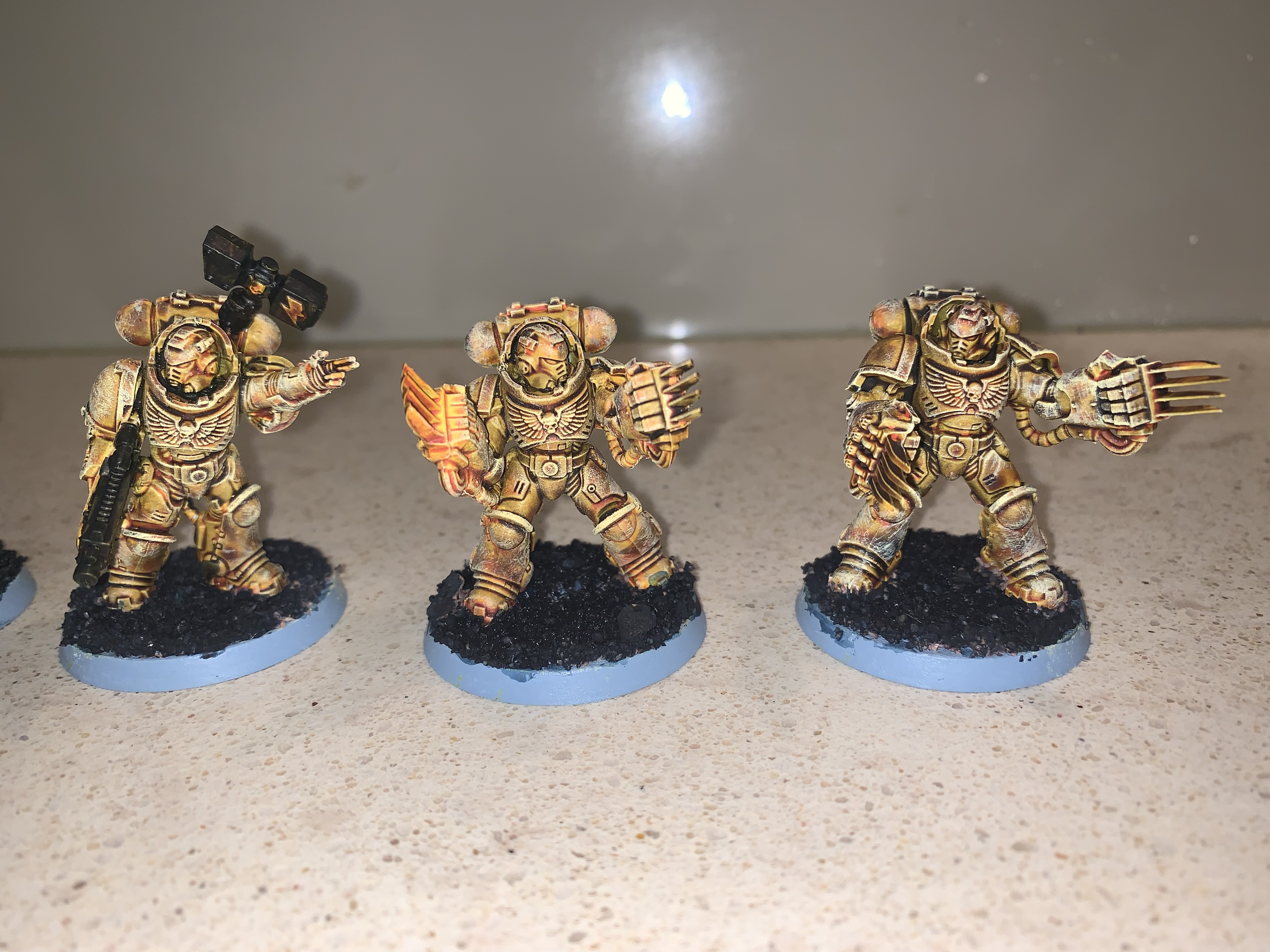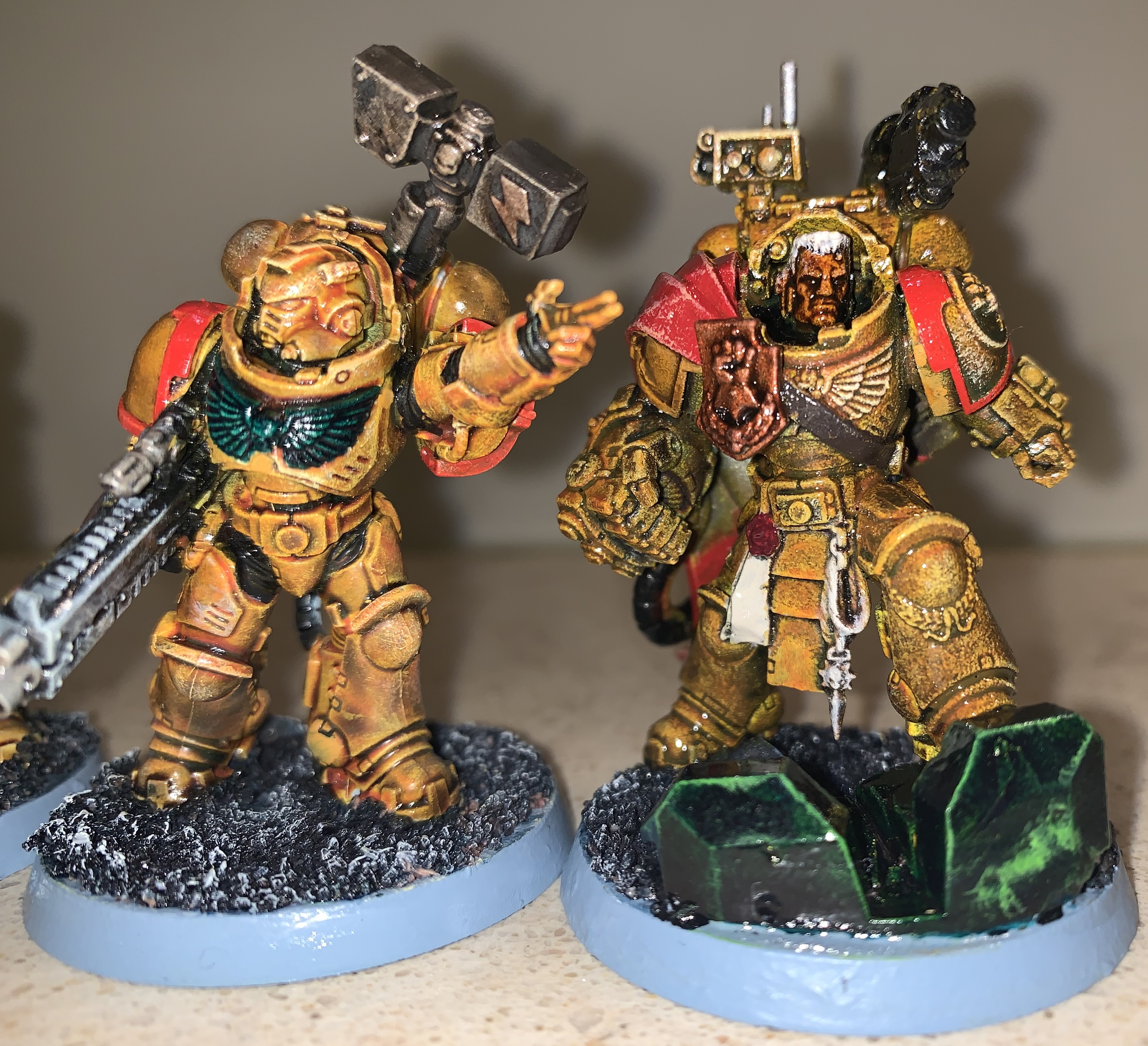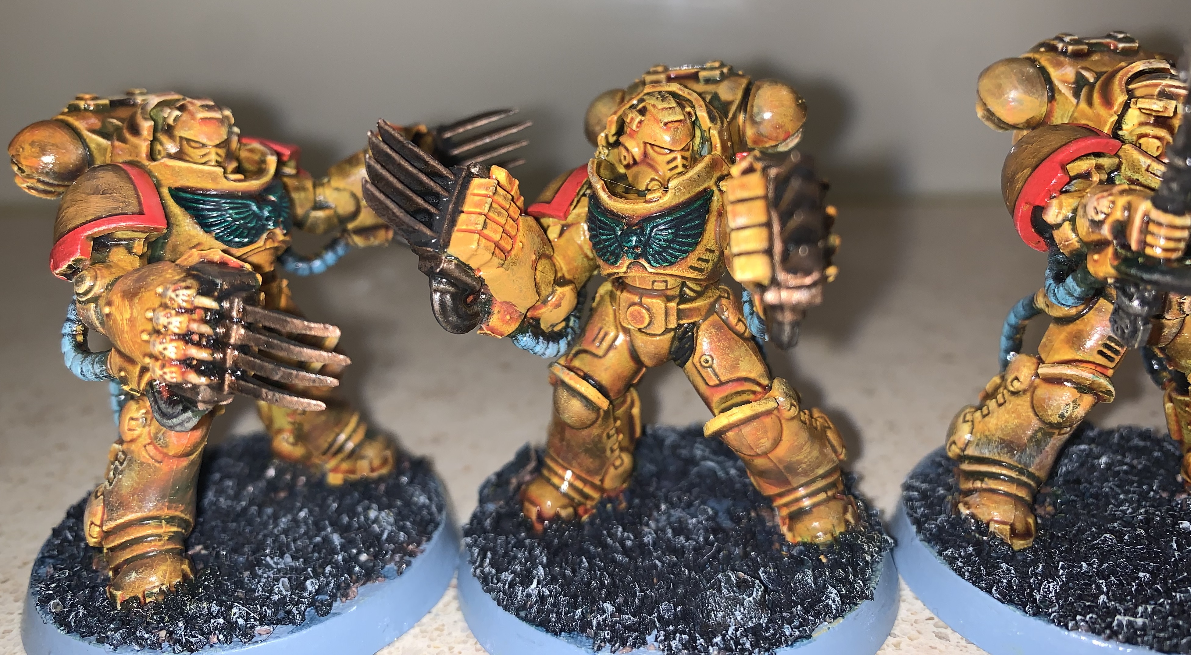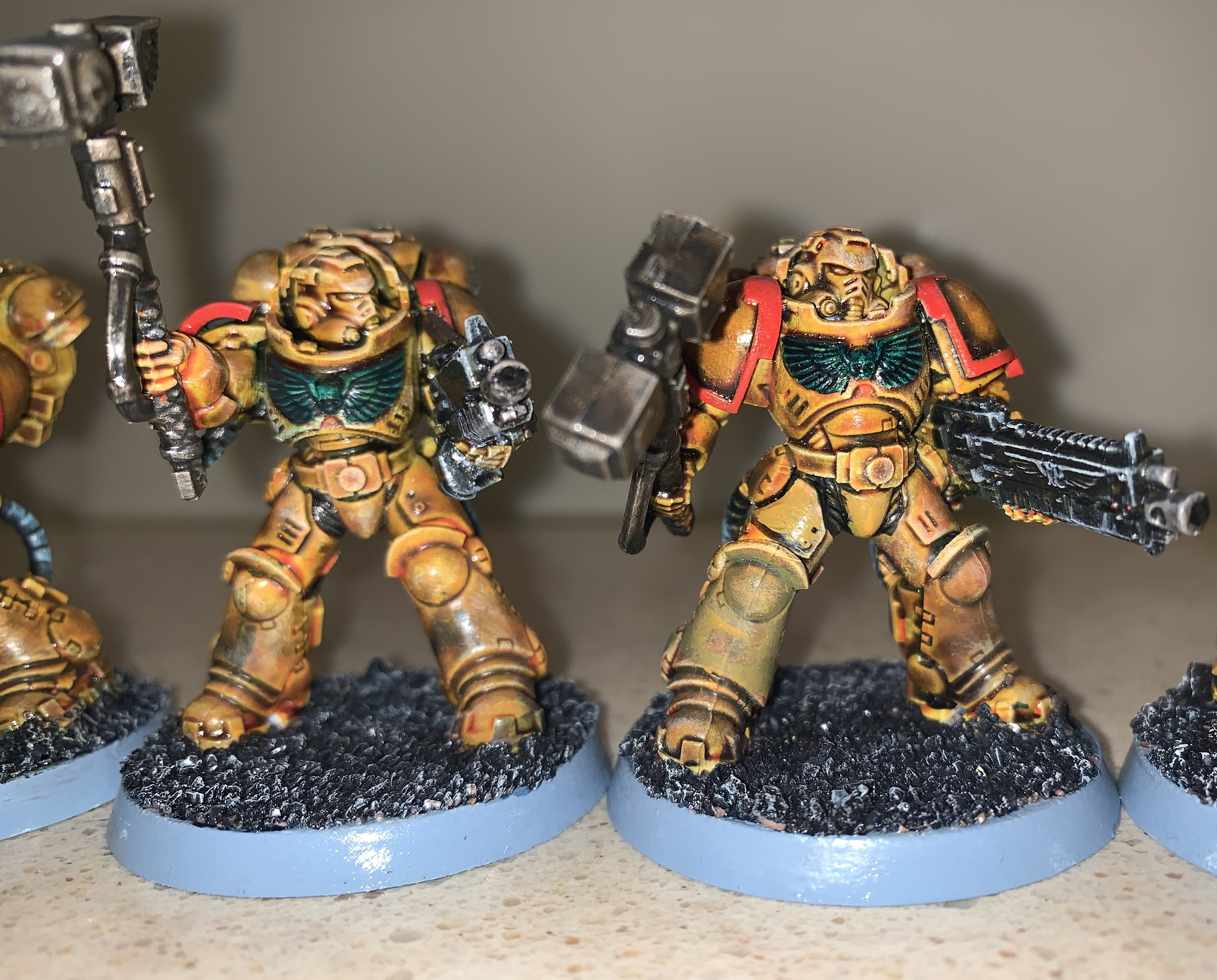 The details you've painted look very clean, which shows good technique, but does clash a bit the messy/weathered look of the main color. I agree that you should do the red before hitting the model with washes. They look pretty good overall though. Once you feel up to it, I'd also paint the eyes of the marines. If I recall correctly, you're a bit of a newer painter, so I understand the hesitancy of painting the finer details.