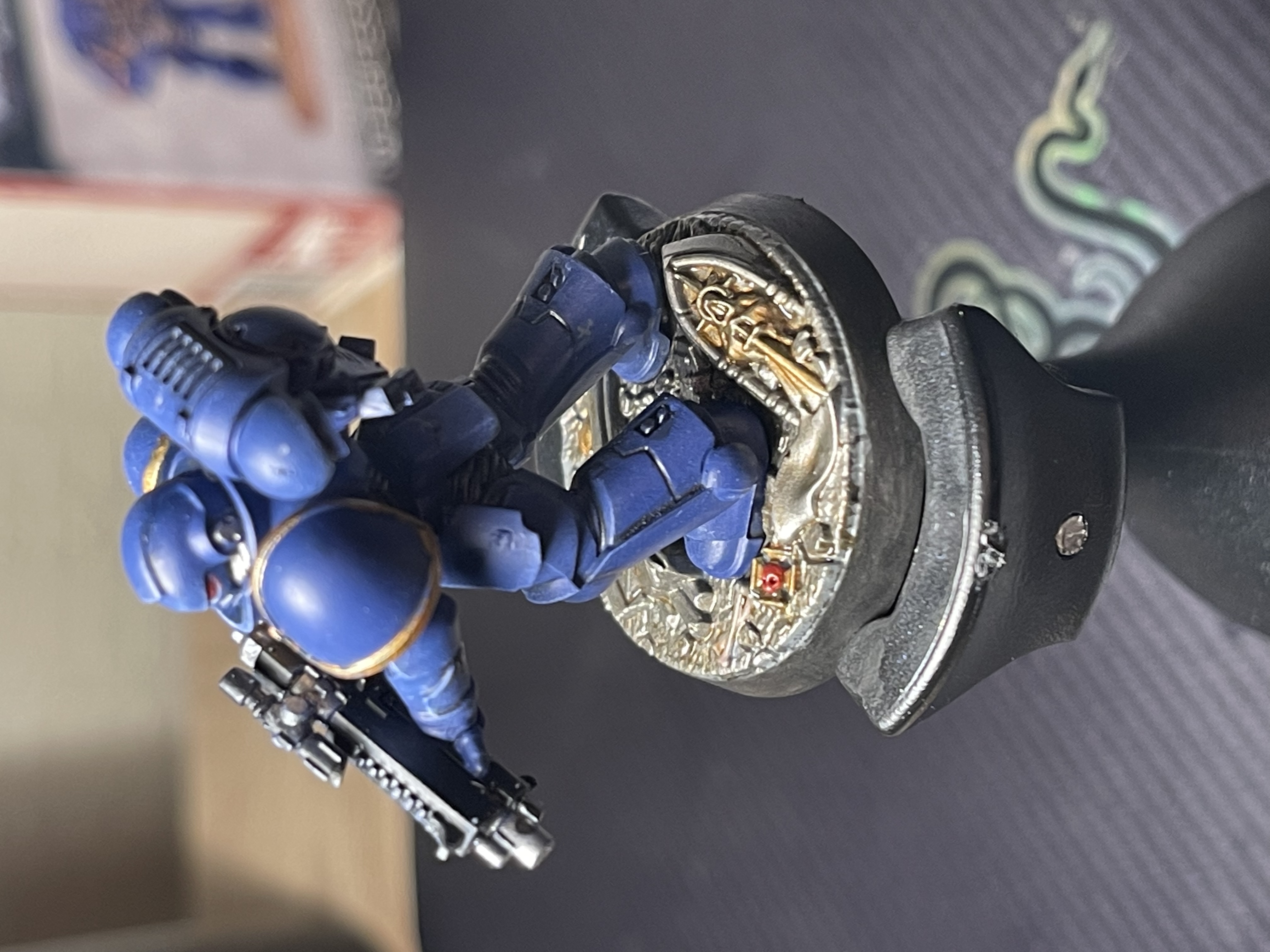 Some nuln oil or agrax earthshade on the base to add some contrast to the metal.