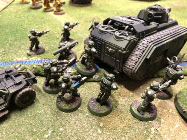 Commandos and Drop Troops deep strike behind the Eldar line and chew up a Dark Reaper Squad attempting to flank the Imperial advance