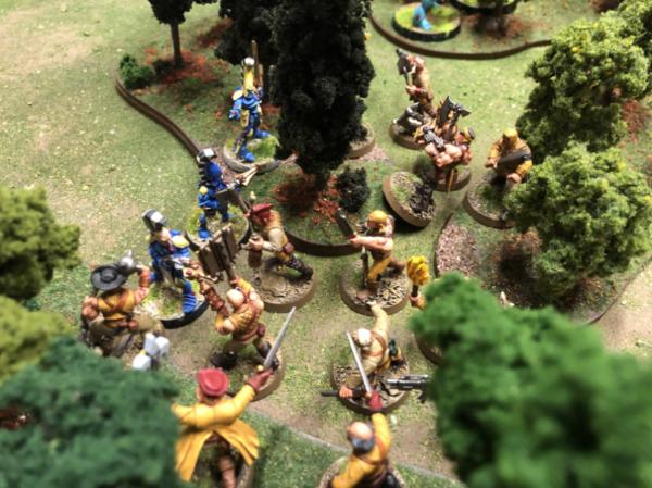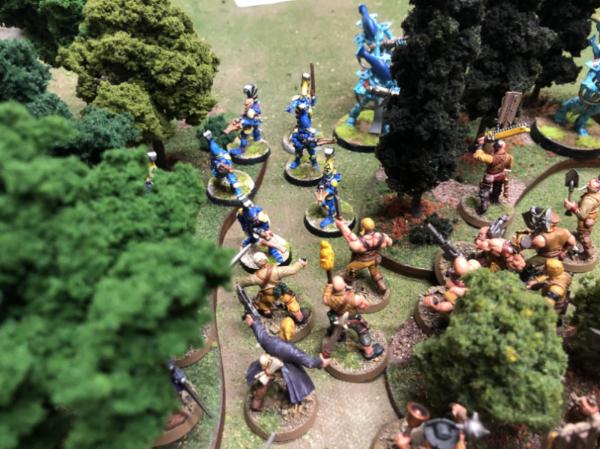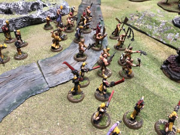 Church rabble crash into the Dire Avengers, pulling down the elite infantry with weight of numbers