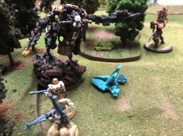 The Eldar receive a surprise of their own as a penitent engine crashes through the trees and into the remaining guardians