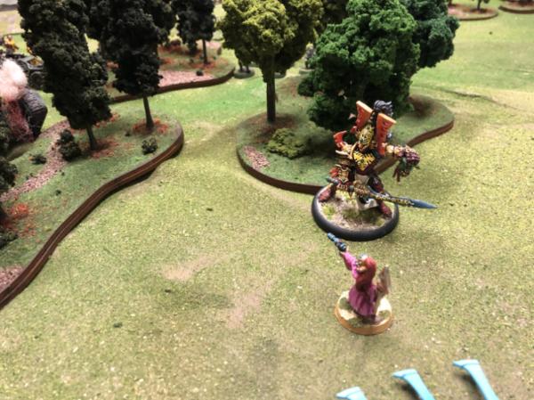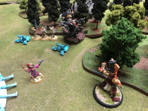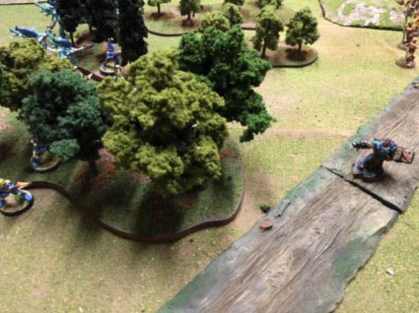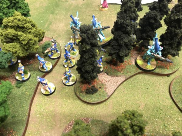 Farseer Asurtelar doesn’t need his runes to see where the battle is going. With a psychic signal, the depleted Eldar forces disengage and melt into the woods….