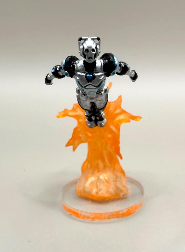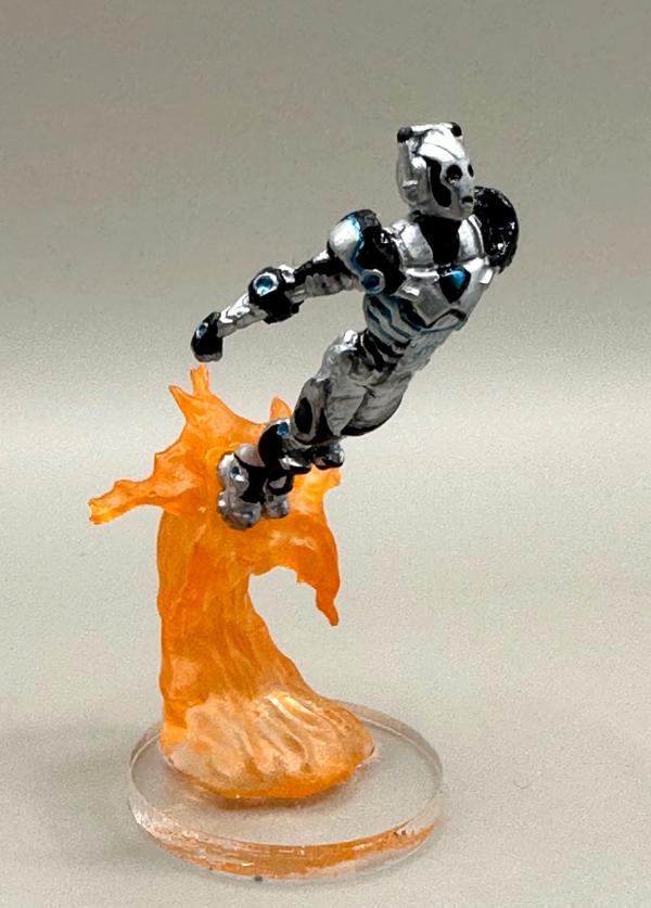 Plain silver is canonical for Cybermen, but I livened it up by adding glowing blue elements and breaking up the silver with black armor sections. (For purists, there actually is precedent in New Who for Cybermen having glowing blue power cores.) After doing all that work on the chest I wanted it to be visible, so I replaced Iron Man's horizontal jet boost with a rising arc of flame from a Heroclix Wildfire model that I got cheap. I like the resulting position a lot better, and it gets rid of the awkward transparent column that holds up the Iron Man model.