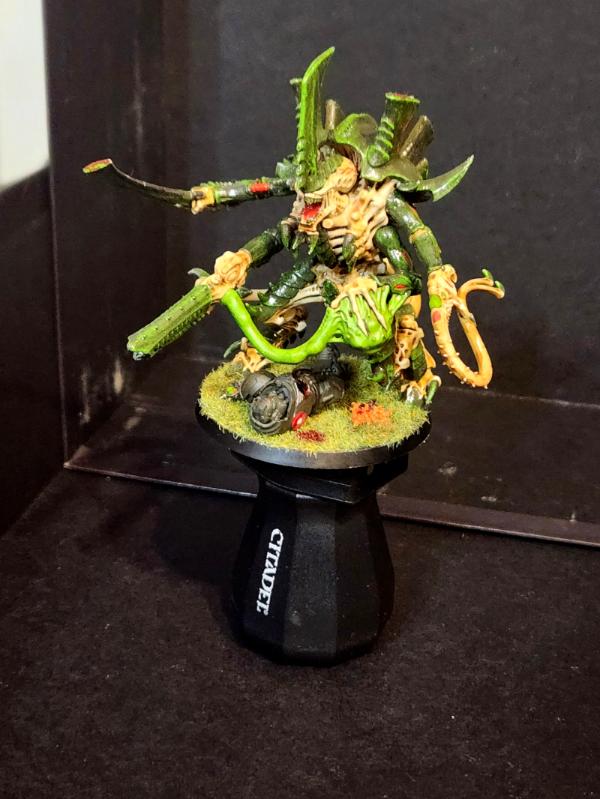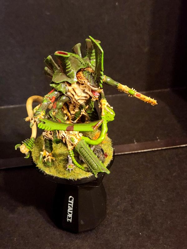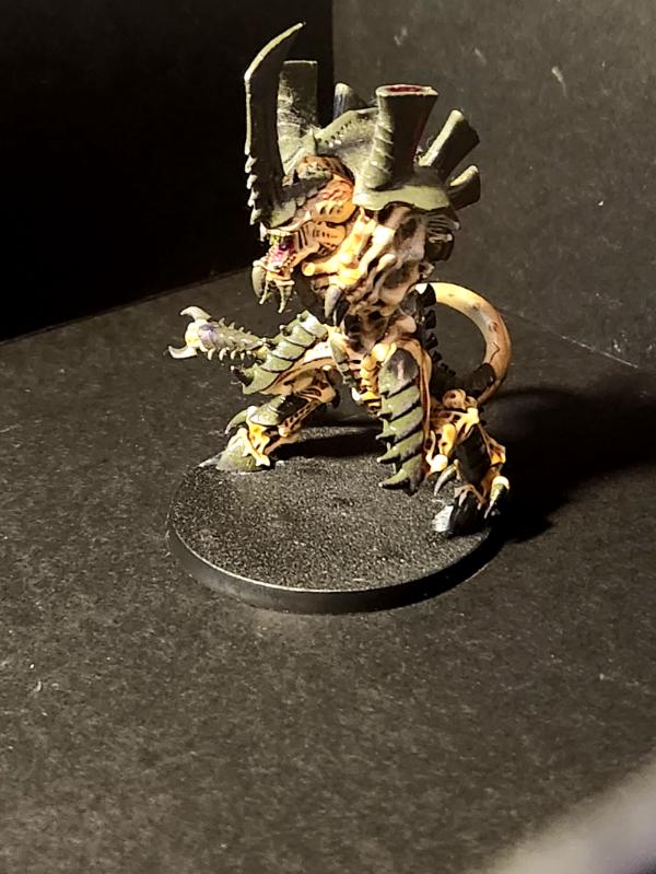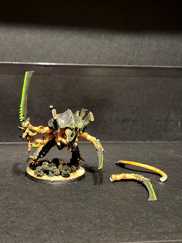 My Swarmlord. His tail needs re-glued, and the magnet for the missing arm put back in. I have an extra, small spike on his head to better match the old art. I also used Tyrant bone swords for his upper arms. I like the large sword/small sword better than the four small swords the kit comes with.