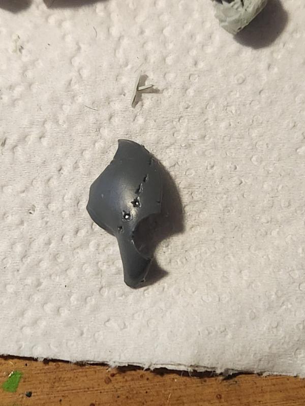 I did the hole in the torso by drilling a hole in the torso with my dremel. Up close you can see that the inside of the torso is hollow. If I do an injury like that again, I'll pack the sides of the wound with putty and put some red and dark pink in there.