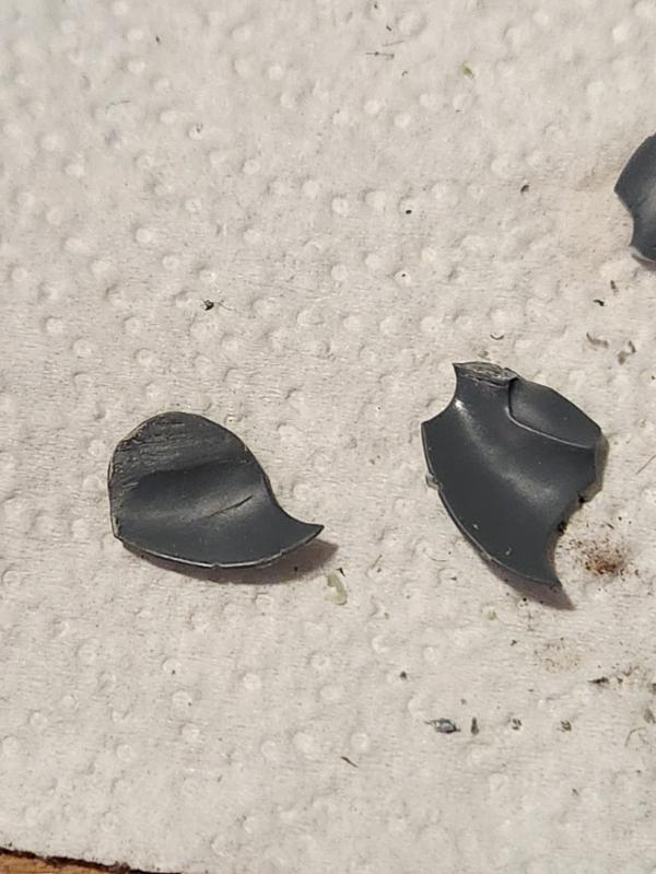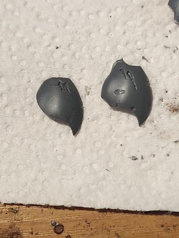 This is a bit of extra carapace that is intended for the newer version of the Tyrant Guard. It makes them look bulkier and more like a living wall. I didn't like how my arm conversions were going to leave my sword Guard lacking in shoulder plates, so I decided to trim this bit into one that would fit on the older style modelsGetting them right took some trimming and sanding. I want them to lie flush on the back plate of the model. The underside of the bit is intended for a completely different fitting. I had to take of a substantial amount of material.