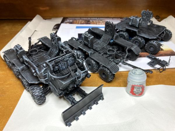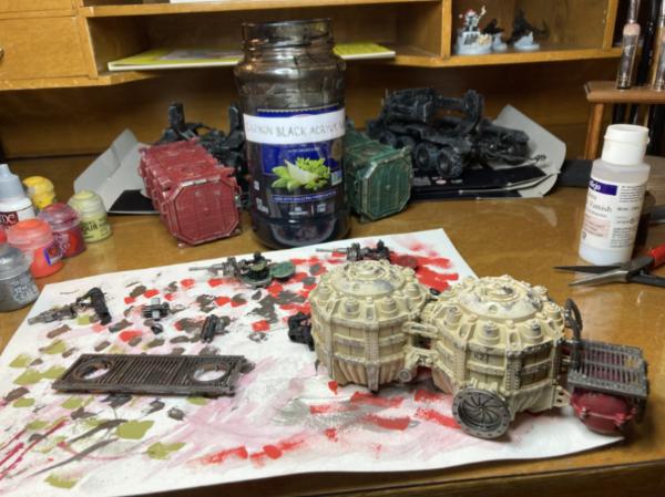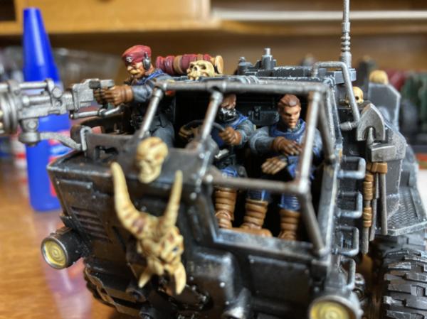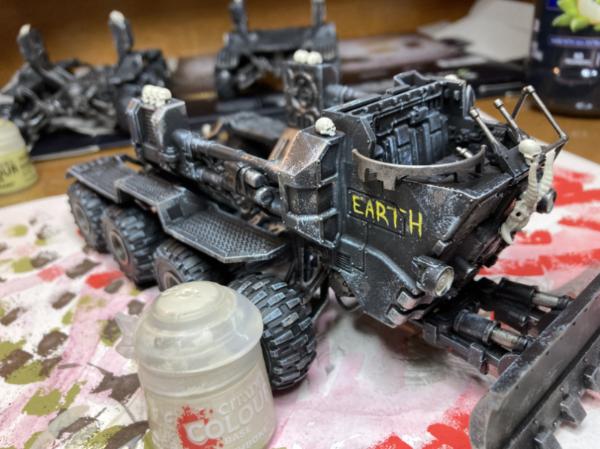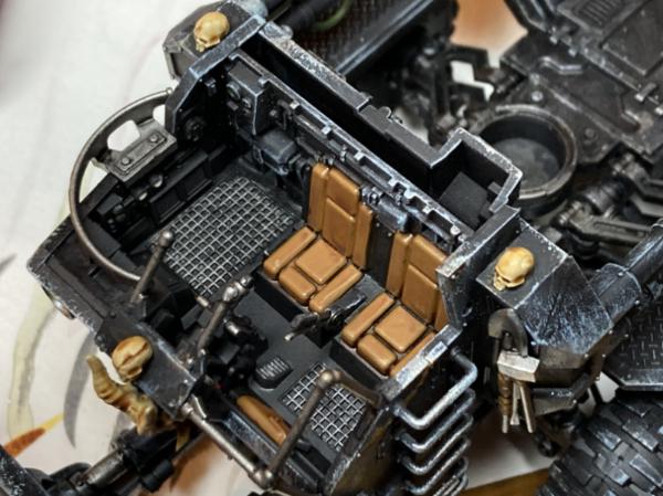 I adorned the vehicle with many, many skulls. Now I must paint them. Plenty of Wraithbone was used.