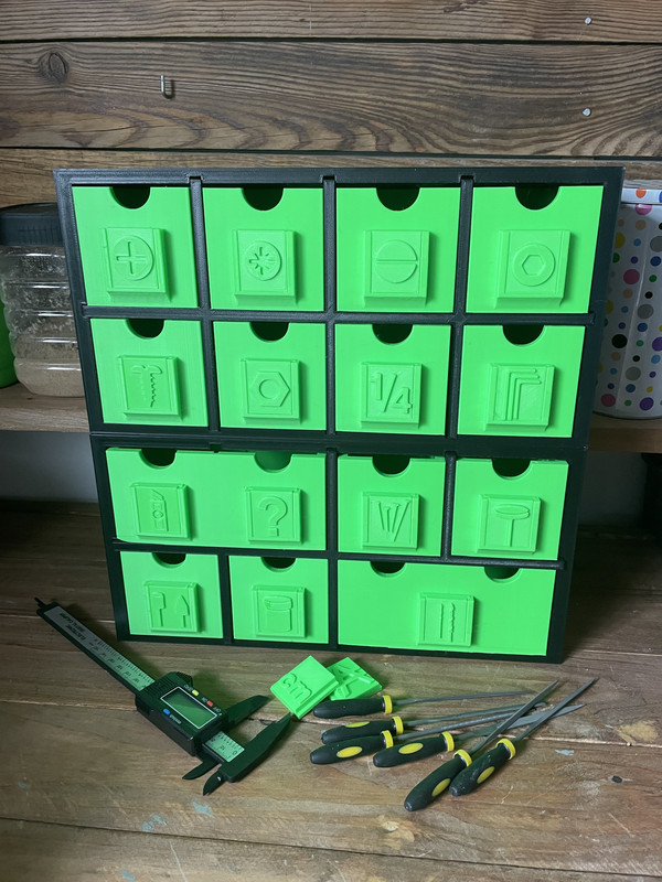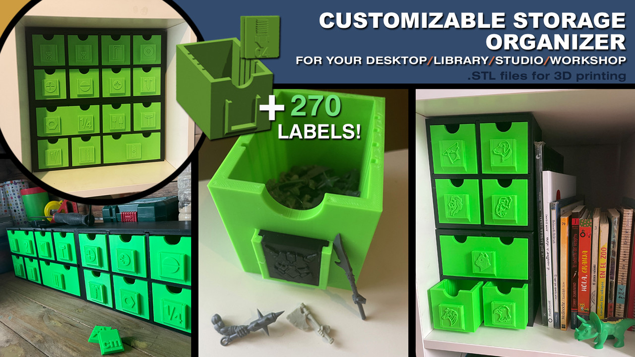 I wanted to share the last project we were working on at home: a storage organizer intended to be placed on your work desk or shelf, with customizable drawers including more than 270 possible covers, which can be displayed by simply sliding them along the guidelines on the front of each compartment.