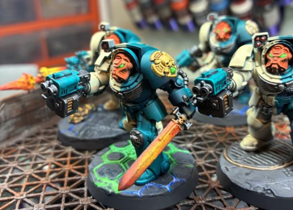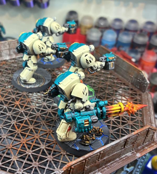 Flinty - more halved schemes, well executed! something I've always been too scared to try. The firing effect on the assault cannon comes across really strong and I love the extra interest of the multiple colour/power lines on the basing.