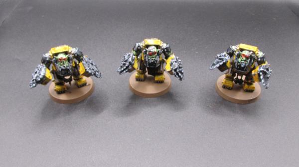 Hi, here are Ork Mega Nobz that I painted up in Bad Moonz colors for fun.