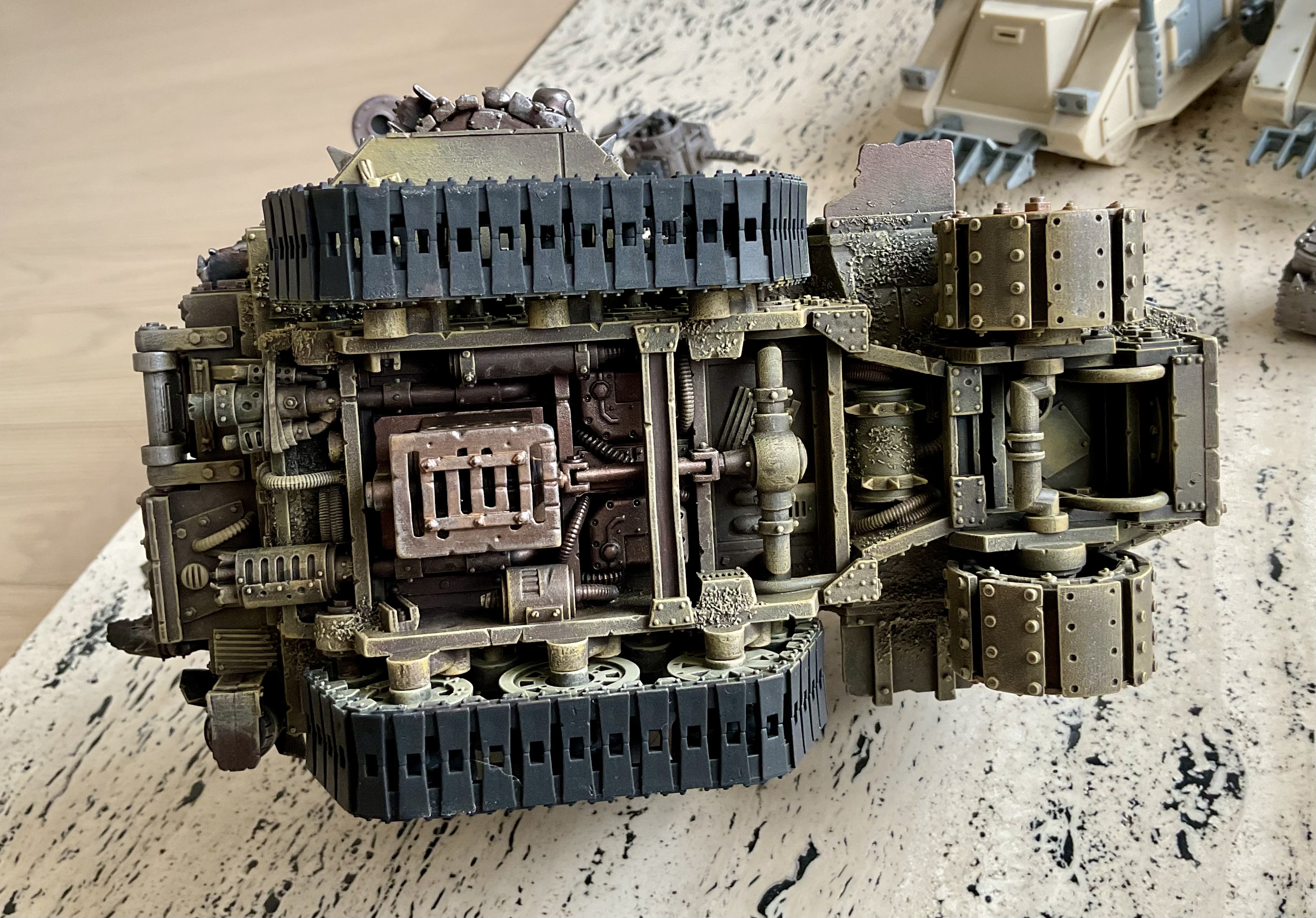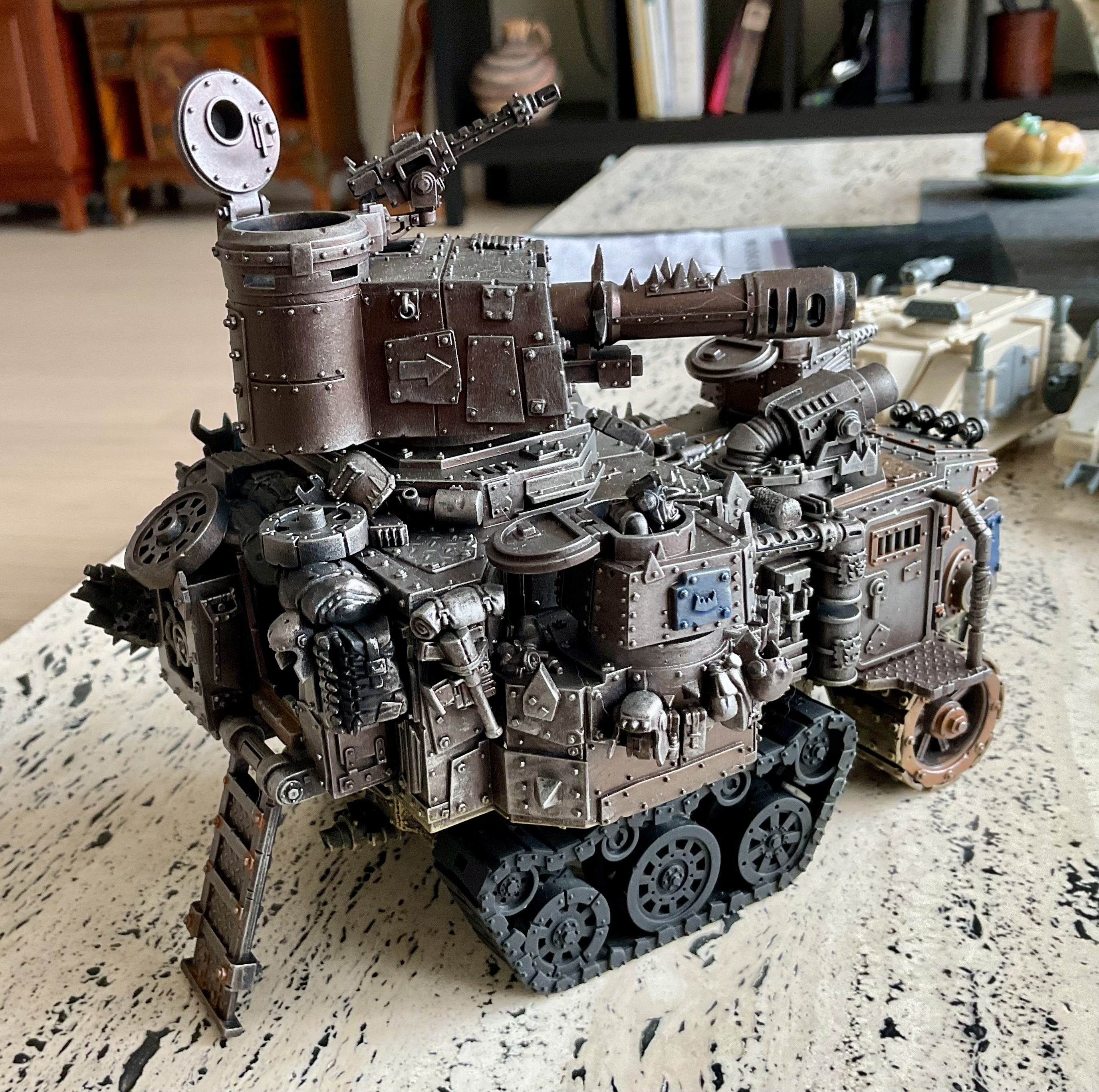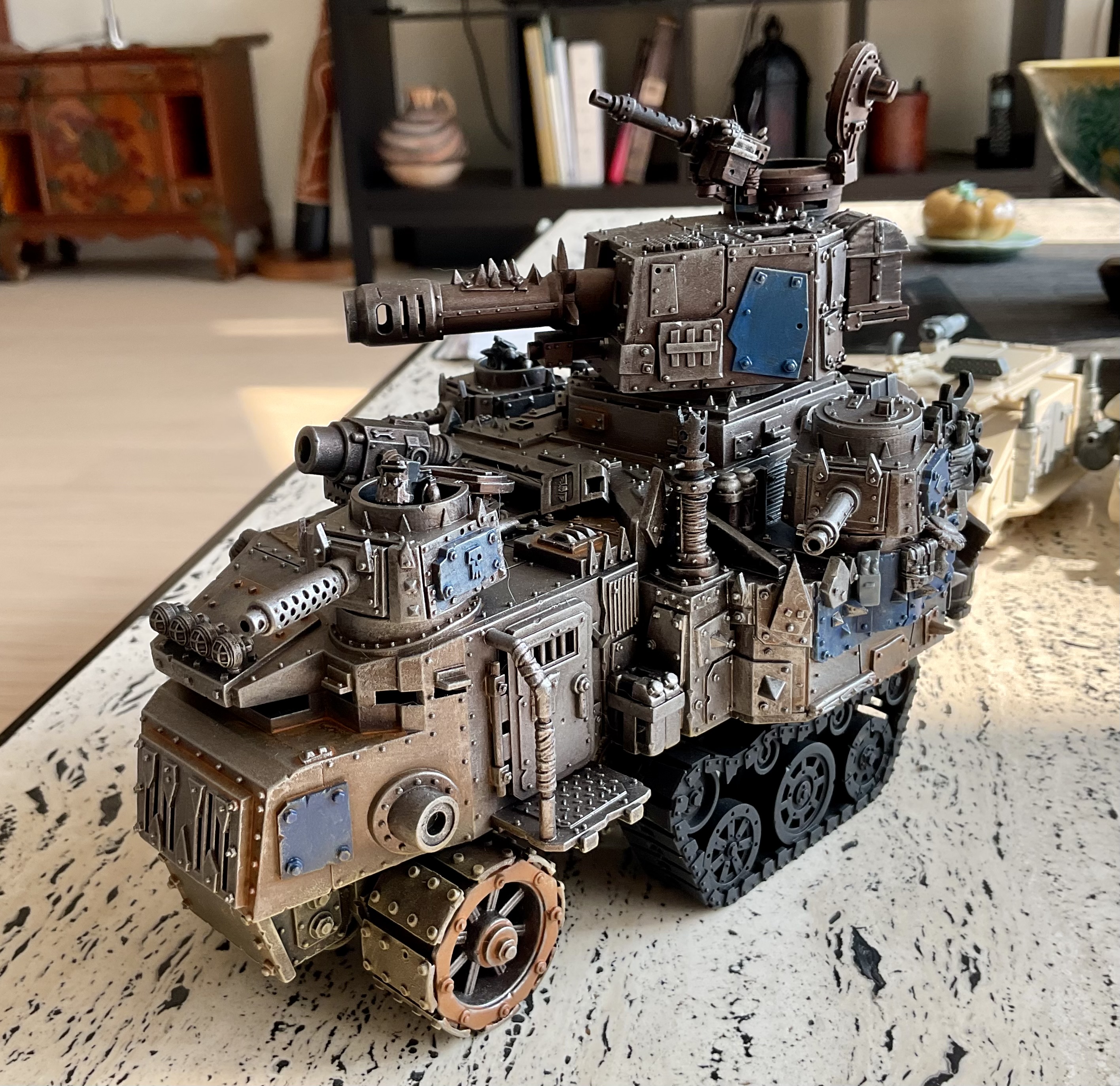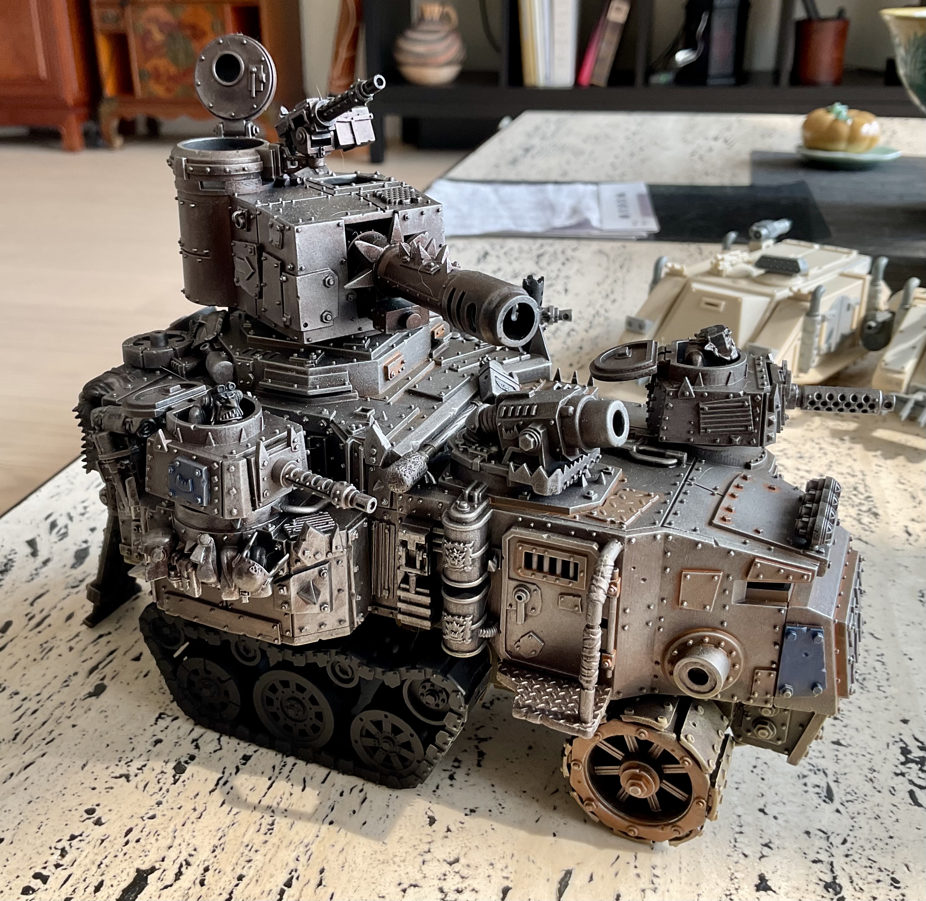 I started working on this model when the Battlewagon kit was released. I felt that it was too narrow, and set about widening it, so there is about 1cm of additional width. One thing led to another, and it became a fully enclosed vehicle with multiple turrets - a true ‘battlewagon’. But I didn’t like the wheels, which seemed inadequate - especially compared to the awesome wheels from the original Battlewagon kit, which looked like they’d been looted from a WW1 heavy artillery piece. The WIP model got shelved for years. I came across it in a recent move, and decided to try and finish it in honour of the new Ork models arriving with 11th Edition. And I bit the bullet and went on eBay to find some wheels from the original kit. They cost a small fortune, but I think they make a difference.