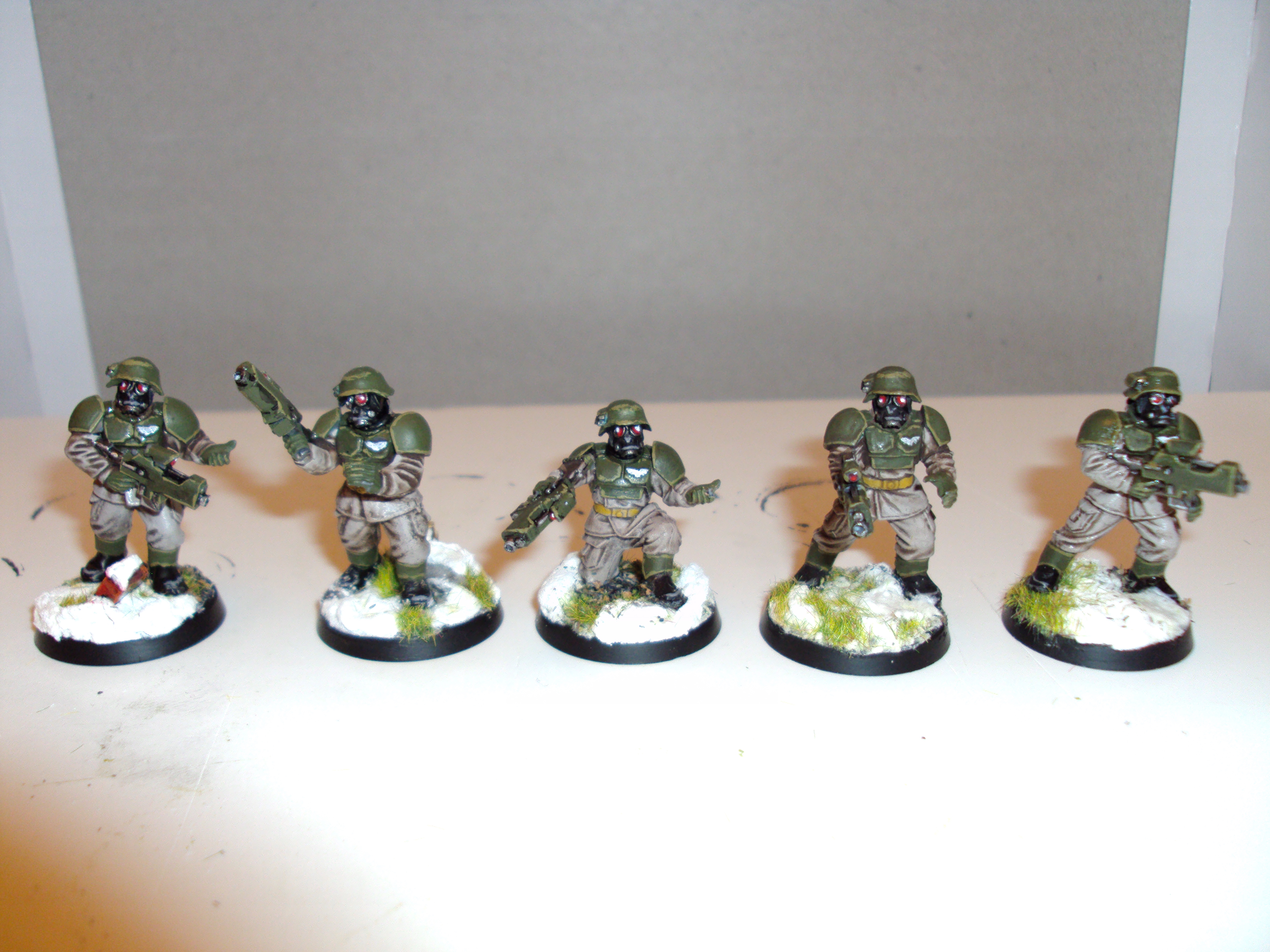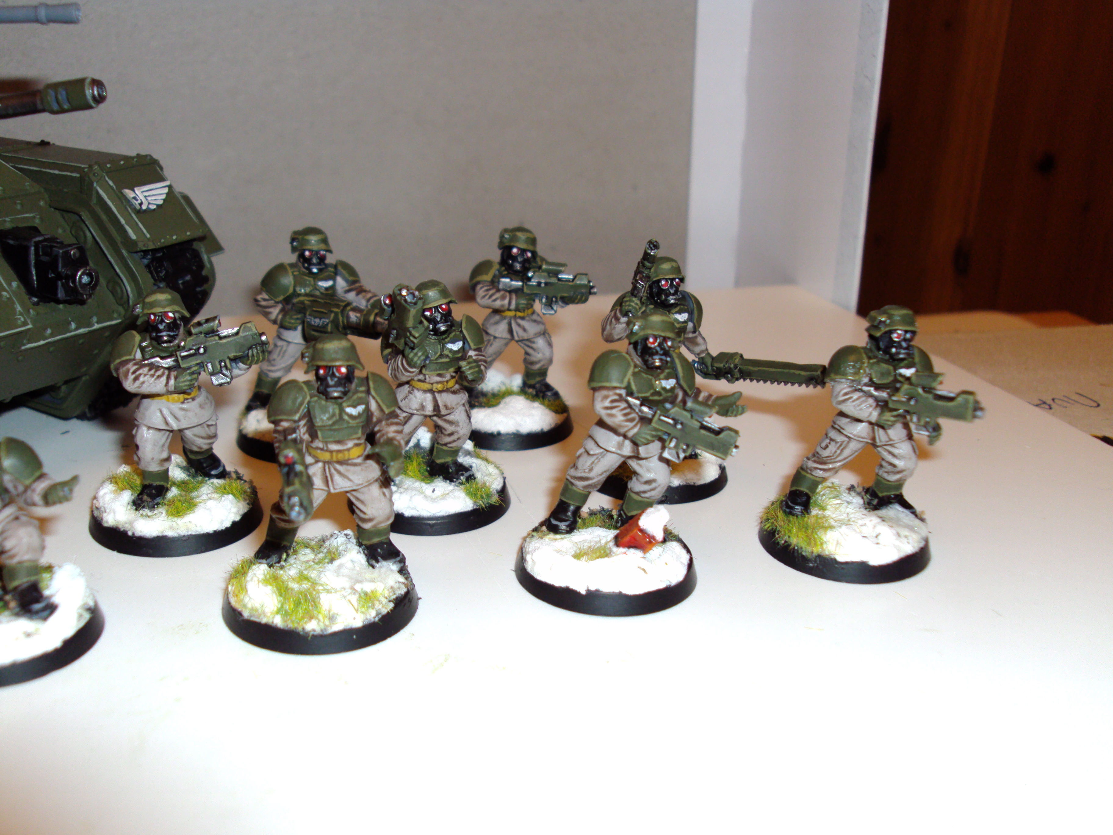 On the catachans, how are your GS skills? I am thinking that a bunch of bare armed and bare chested soldiers may not do too well in snowy-spring setting and may need a few furs or cloaks to keep them warm, painted in greys and white they may even help tie them further to the basing?