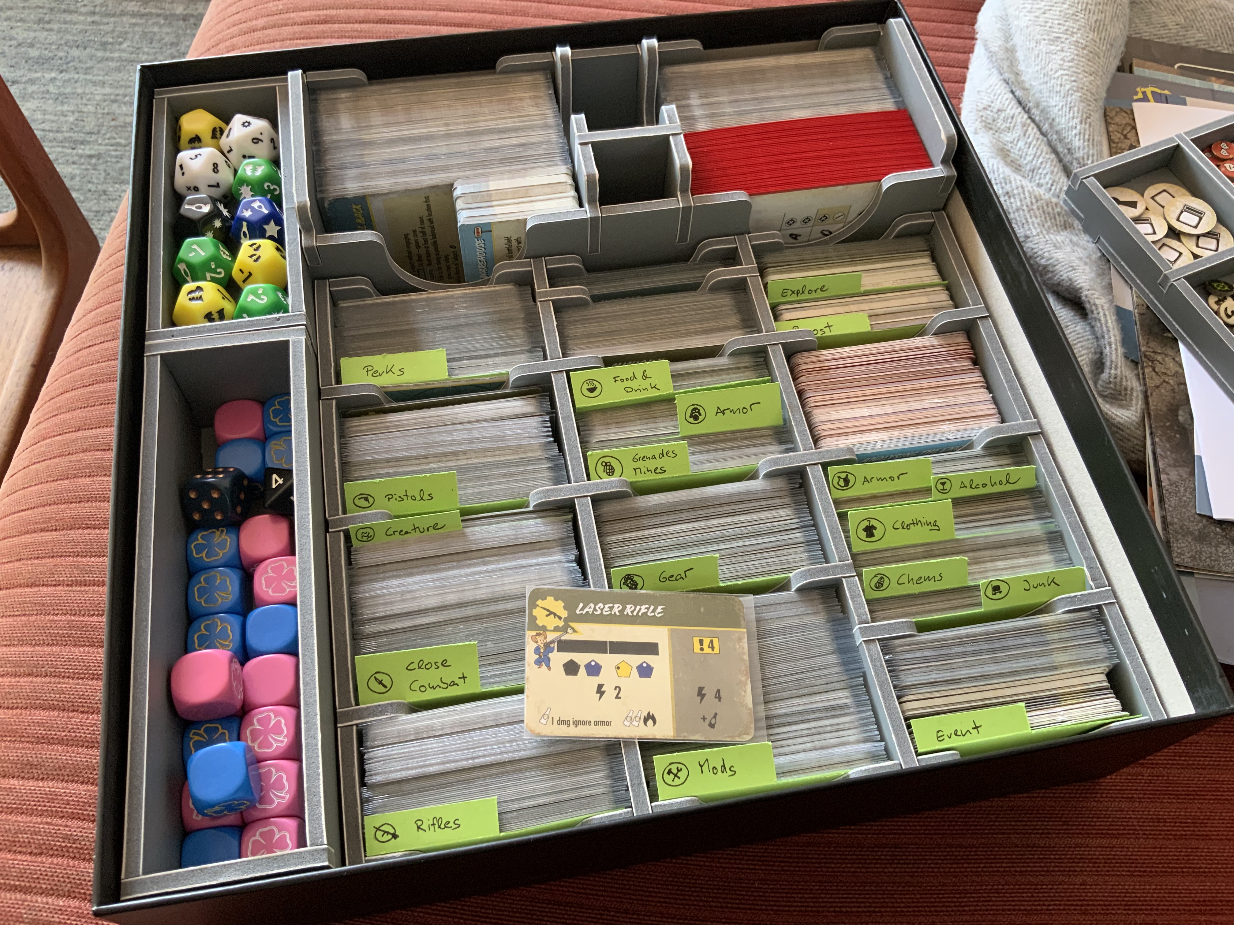 Been doing more pointless rolling of the dice, quite like the laser rifle and as pointless as it is, shooting it at an advancing Deathclaw is a fun way to better memorize stuff. Getting steamrolled by it a lot, but both its attacks have interesting mechanics that I've been trying to understand, especially the opposed rolling. Str 11 versus Agi 7 seems like a contest that's unwinnable unless you roll an X.