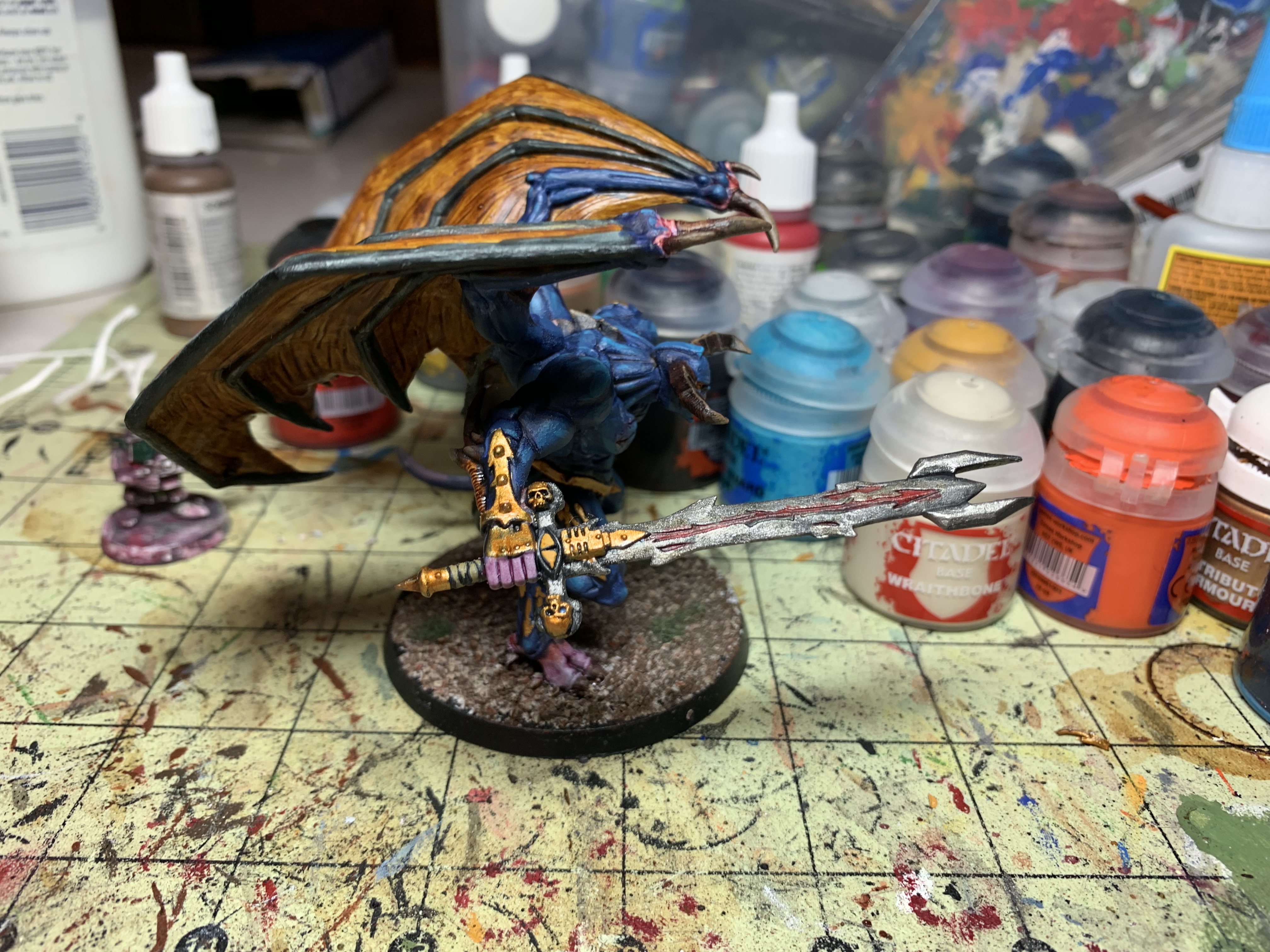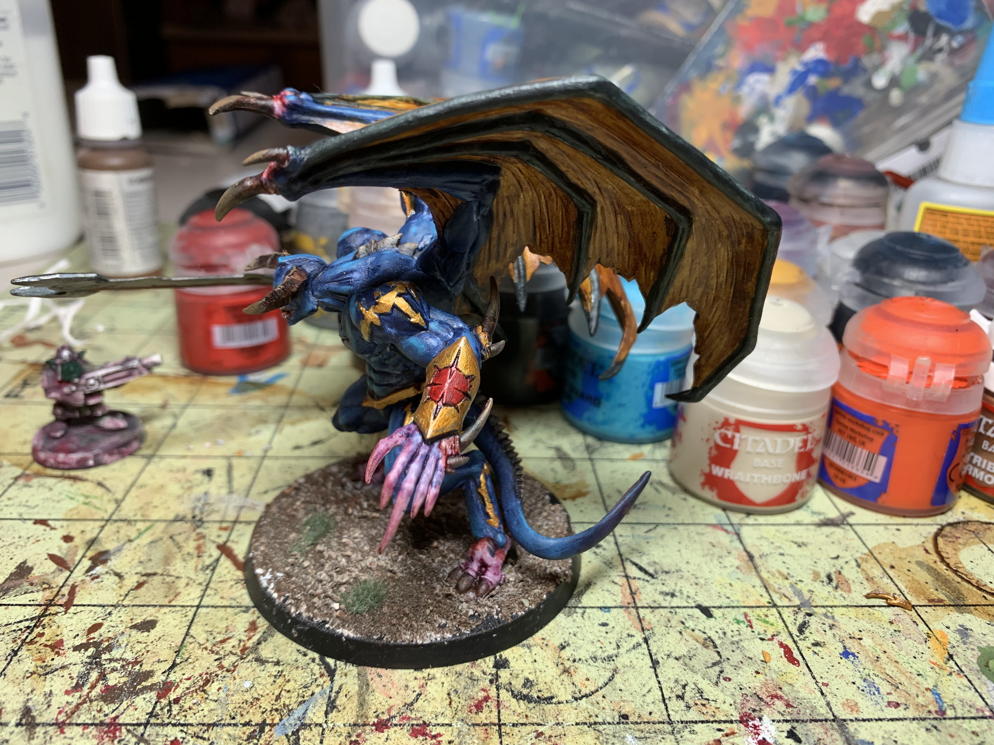 Your rescued Daemon Prince looks great, but I agree with vejut that the wings would look better being a bit lighter. The underside looks ok, but the top looks to have suffered from pooling. Maybe a bone colour drybrushing would help bring out the contours more?