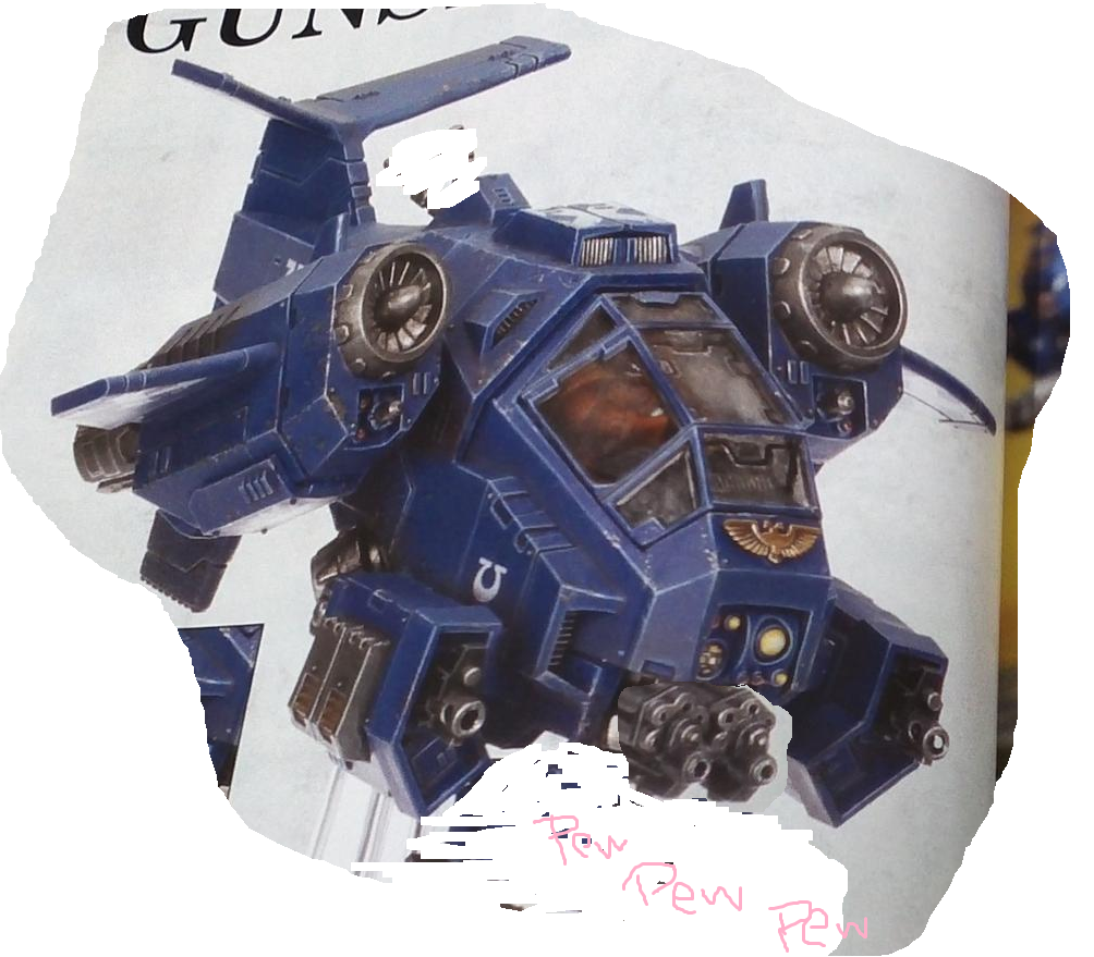 ShumaGorath wrote:three nose intakes, optional airfoils, wing insignias, two kinds of exaust, tack on wing fins, optional hull exaust, optional wingtip fuel cannisters, optional iron sights on the guns. I wouldn't call that a minimal amount of random crap on vehicles that are seemingly only differentiated by their rear cockpit weapon and the stuff hanging under their wings. Some of it could be custom by the GW staff, but we can't really know that for sure. None of it's a wrecking ball, but that'd be over the top.