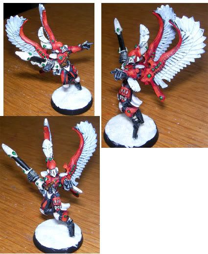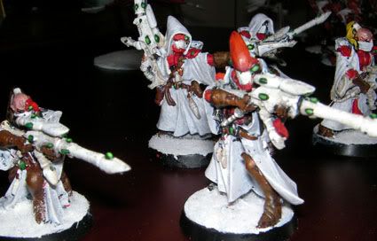 Anyway, I like most of the models. I think the basing on most of the models could be cleaned up, The white on the falcon looks alittle patchy, I dont know if that is what you were going for. I like the Maugan Ra, and the red effect you get on most of your armor, but on some of the guardians armor it looks like it needs to be cleaned up. BTW I really like the Swooping Hawk Exarch. -Nick