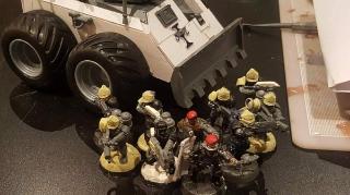 PDF Veterans Squad - Ranged support, Autocannon and 3 x Grenade Launchers. The wheeled gun platform is a combination of Zinge Industries parts