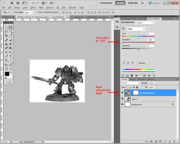 5b. (optional): At this point you may be thinking: 'That's cool, but I really liked the paint job on that guys base, and the sword is pretty cool too.' Fear not! If you want to retain the colour from part of the model we can use a 'mask' on the adjustment layer - only the unmasked areas will be desaturated. Handily an adjustment layer has a mask attached to it by default - it's represented by the white square thumbnail in the Adjustment Layer (see pic). To mask an area, click on the mask in the layer window, then use the paintbrush to paint pure black onto any of the image you want to retain colour. Paint with the adjustment layer selected, not onto the original image. I've kept the guys sword and his base as the original colours, as they'll fit in nicely with the colour scheme I have in mind.
